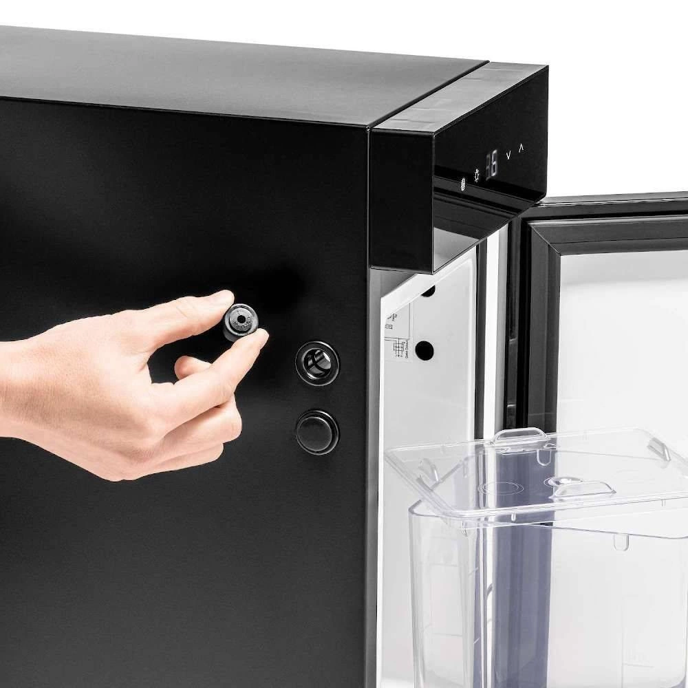 • Dva univerzálne otvory na hadičku – umožňujú pripojenie chladničky ku kávovaru z ľubovoľnej strany, čo uľahčuje umiestnenie zariadenia v akomkoľvek pracovnom priestore a zabezpečuje automatické odoberanie mlieka pri príprave mliečnych káv.