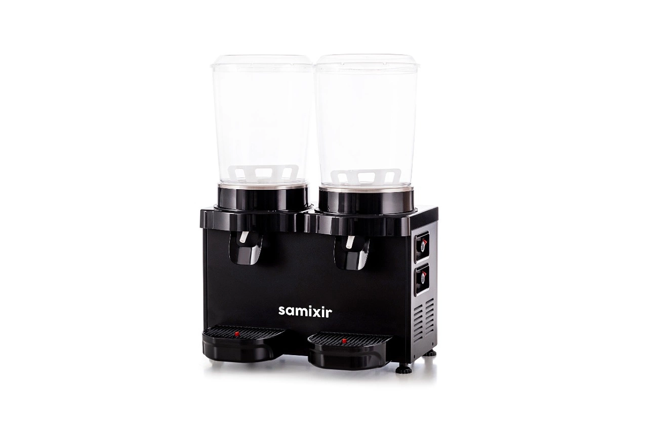 Dávkovač SAMIXIR MM20.AB_R290 bol navrhnutý s dôrazom na pohodlie obsluhy a odolnosť. Dve panoramatické misy z odolného polykarbonátu zaručujú bezpečnosť potravín a odolnosť voči každodennému používaniu v gastronómii. Miešací systém založený na pomalobežnej magnetickej palete umožňuje rovnomerné rozptýlenie prísad v nápojoch s kúskami, ako je limonáda s ovocím alebo ayran. Vďaka ukazovateľu hladiny vody v odkvapkávacej miske je používateľ informovaný o potrebe jej vyprázdnenia, čo ešte viac zvyšuje komfort práce. Zariadenie je ideálne pre hotelové bufety, samoobslužné reštaurácie a rýchle občerstvenia.