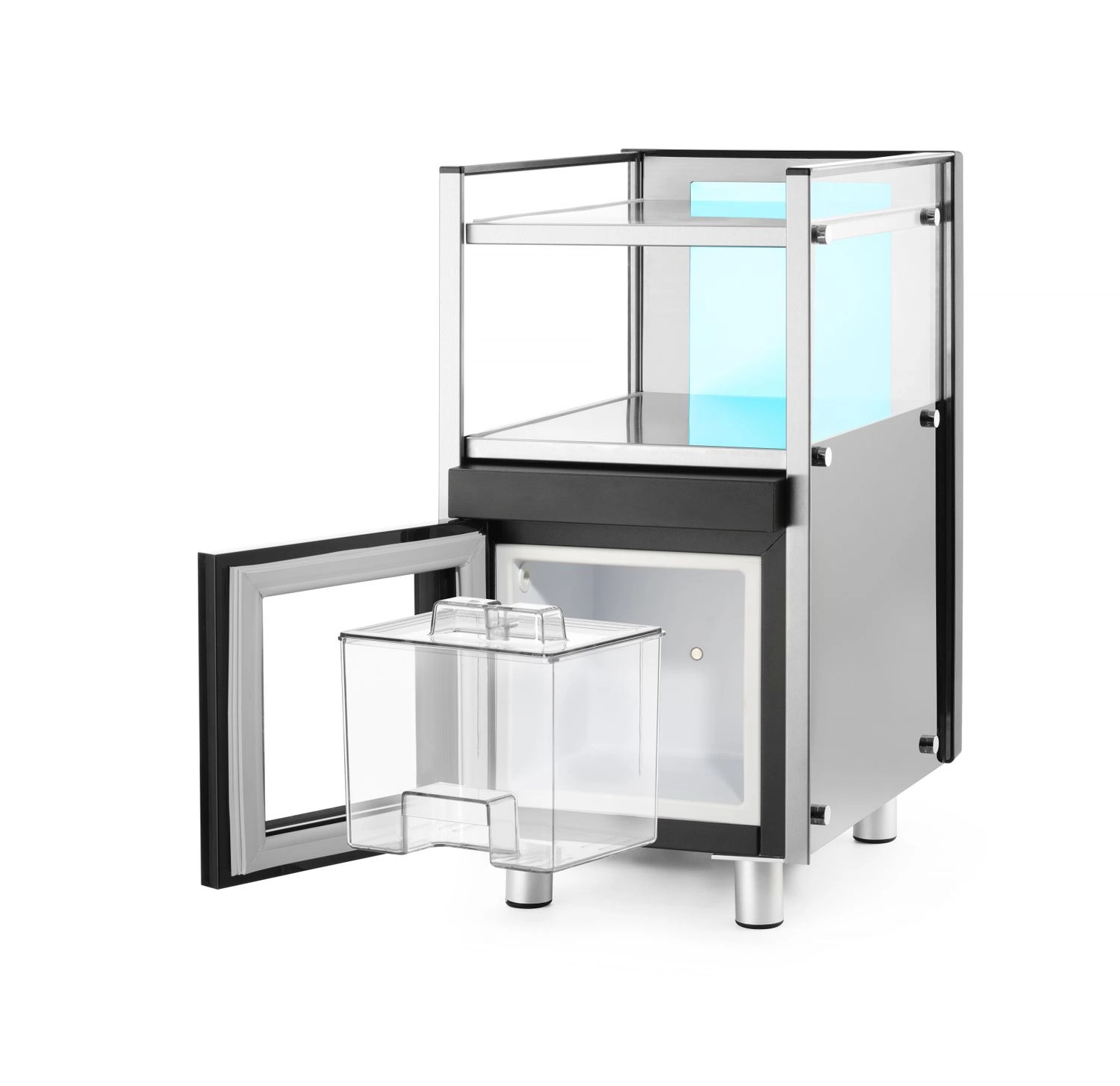 Skriňa kávovaru na ľad z ABS s panelmi z tvrdeného skla. 4 robustné 60 mm vysoké hliníkové nówky, vstup pre hadičku na odsávanie mlieka na boku kávovaru na priame pripojenie k akémukoľvek automatickému kávovaru.