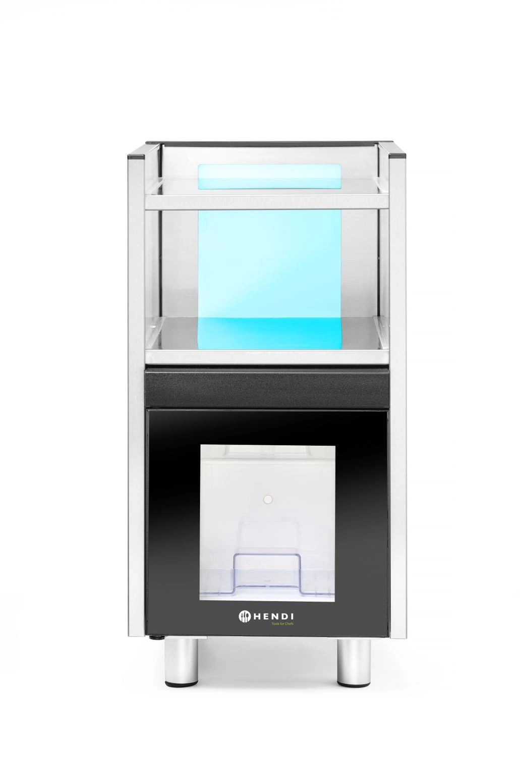 Chladnička na mliekoós ohrievačom šálok od Hendi. Rám z nehrdzavejúcej ocele ASI 430. Nádoba na mlieko zo SAN s objemom 3,5 l, presklené dvere z podvodnéhoóiónového tvrdeného skla. Jednotka má dva vyhrievané poháre pólopatky.