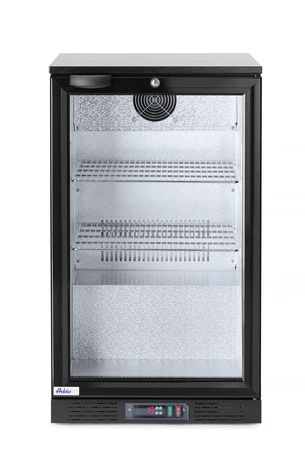 Iceboxóbar s objemom 118 litrov Pre nápoje vo fľašiach. Chladnička je vybavená dvoma chrómovými pónožmi. LED osvetlením v priehradke. Elektronický termostat. Digitálny ukazovateľ teploty. Statické chladenie, ktorému dodatočne asistuje ventilátor. Čierne lakované oceľové puzdro. Dvere z tvrdeného skla v plastovom ráme so zámkom. Extrudovaný hliníkový interiér komory.