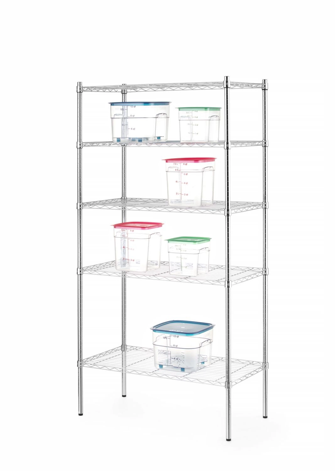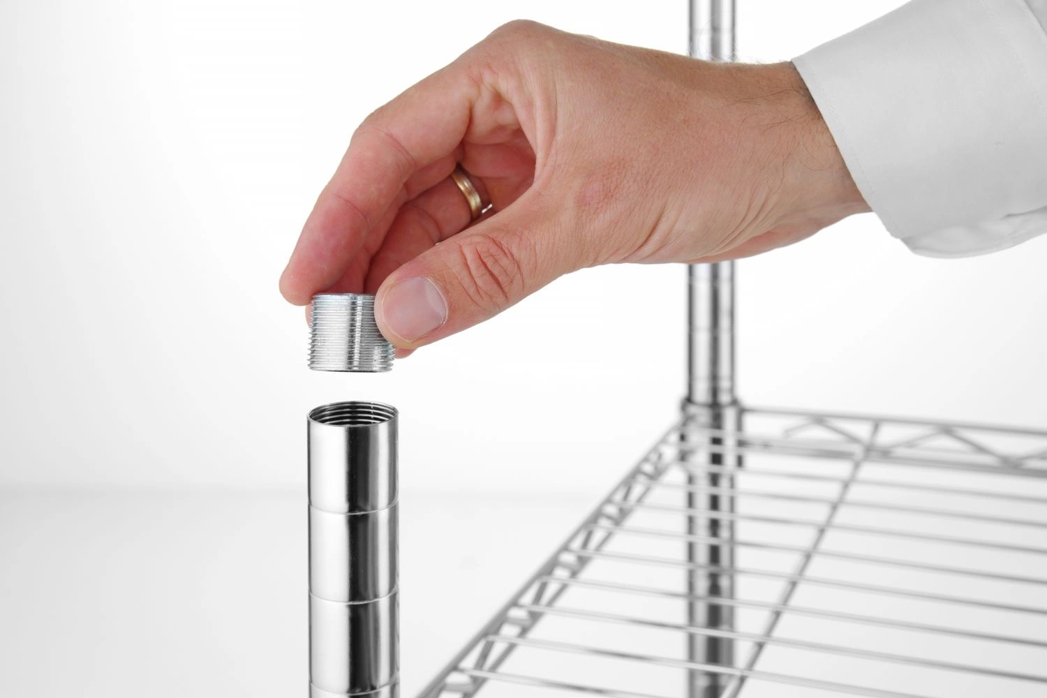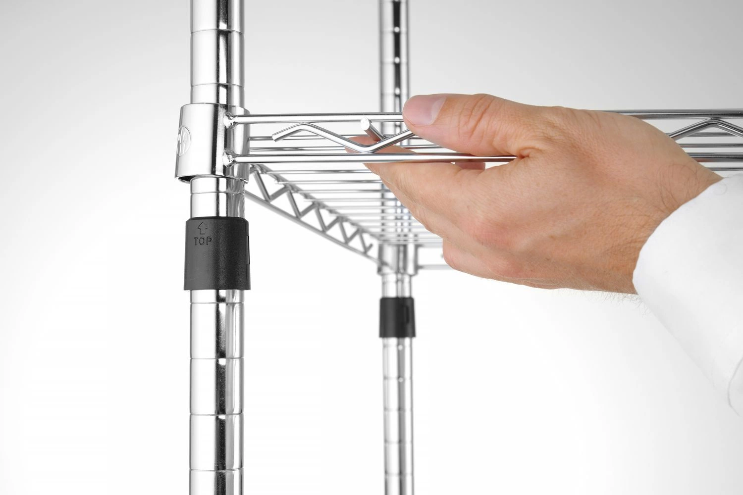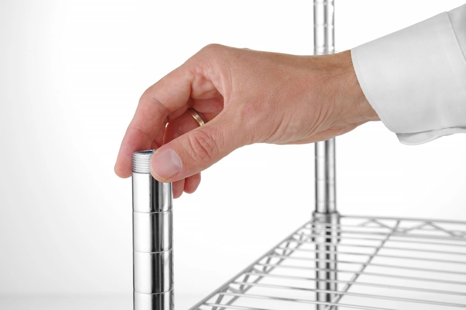 Chrómovaný úložný regál Je vybavený piatimi nastaviteľnými nožičkami s maximálnou nosnosťou 80 kg. Regál sa dodáva v plochom balení na vlastnú montáž.