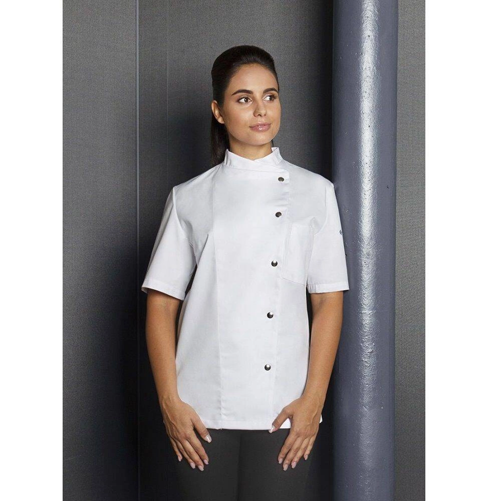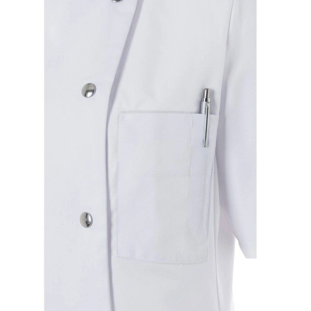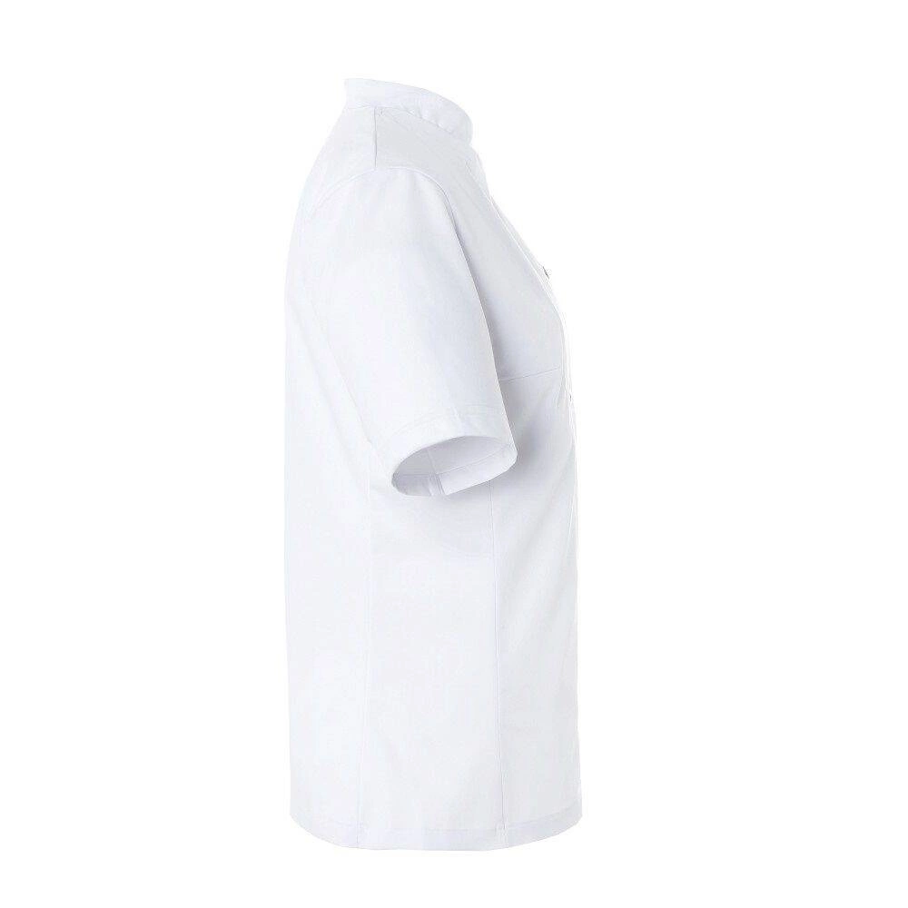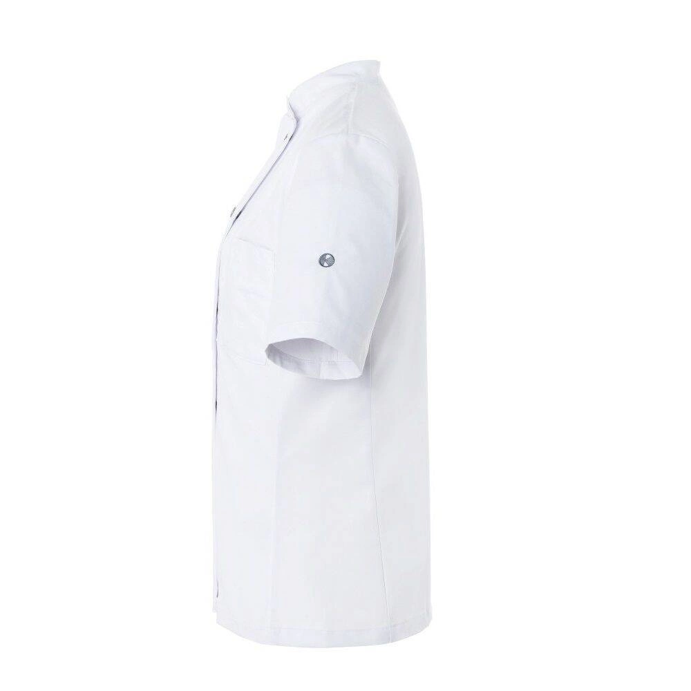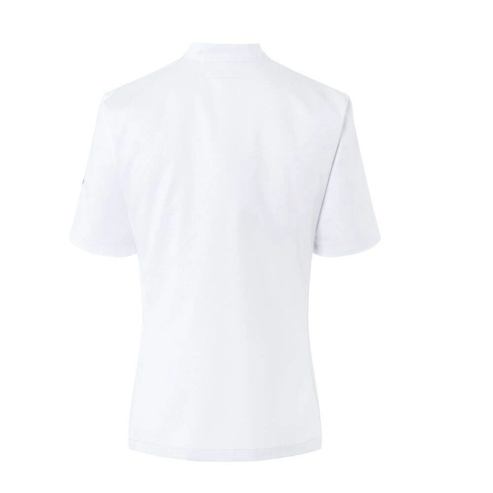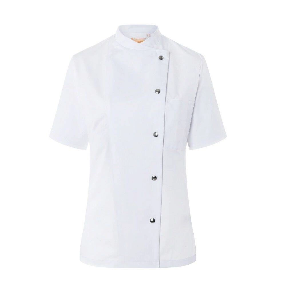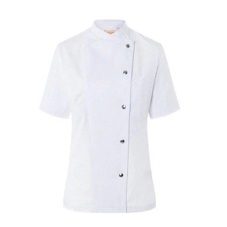 Dámska kuchárska blúzka Greta Chef od značky Karlowsky. Biela farba. Vyrobené zo 65 % polyesteru a 35 % bavlny. Kučeravá väzba. Vypasovaná kuchárska blúzka s krátkymi rukávmi. Strih je zabezpečený záševkami na prsiach a bočnými švami na prednej a zadnej strane blúzky. Na ľavej strane na hrudi je vrecko. Mikina sa zapína na 5 gombíkov a patentky. Môže sa priemyselne prať. Nebieliť. Dostupné veľkosti od 34 do 50.