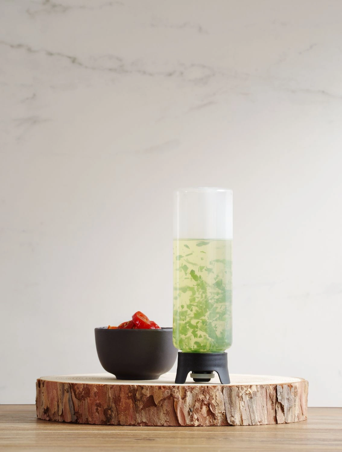 Dávkovač na studené omáčky  s dávkovacím uzáverom. Fľaša je priehľadná.