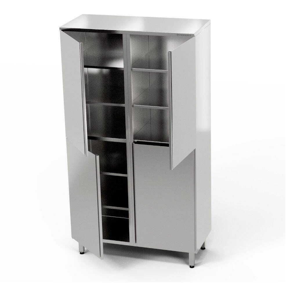Delená úložná skriňa s rozmermi 100x60x200 cm z nehrdzavejúcej ocele J4. V každej časti skrine sú 2 półki. Výklopné dvere.
