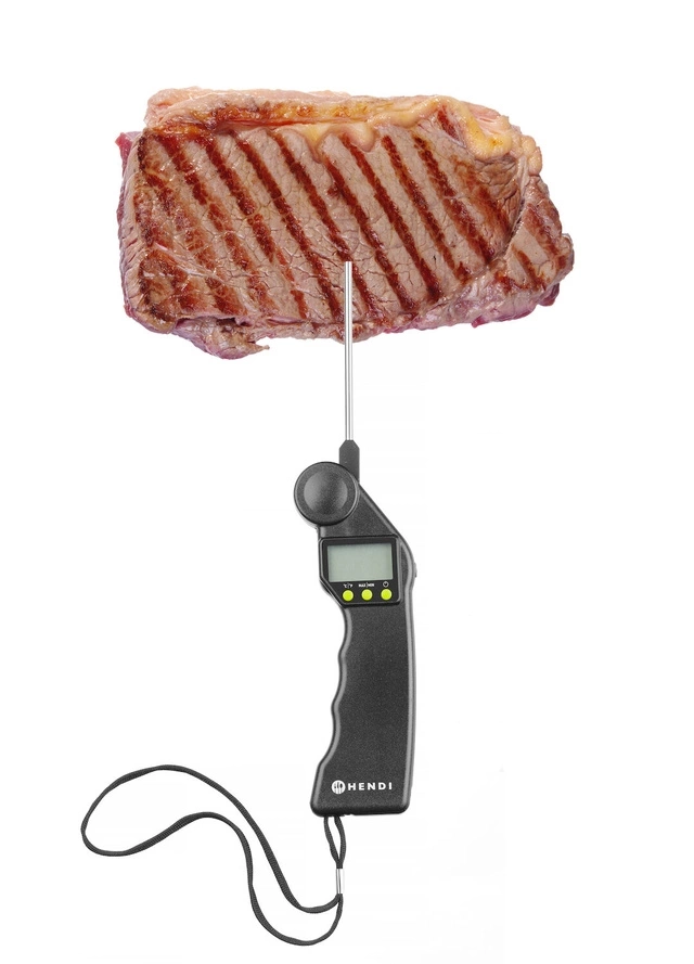 Digitálny teplomer so skladacou sondou HENDI je dokonalým nástrojom na presné meranie teploty vnútri potravín, ktorý zaručuje, že jedlo je správne uvarené a bezpečné na konzumáciu. Tento teplomer s odolnou skladacou sondou z nehrdzavejúcej ocele a funkciami, ako je automatické vypnutie a zaznamenávanie teploty, je spoľahlivým doplnkom každej kuchyne. Vďaka možnosti merania teploty v rôznych jednotkách a širokému rozsahu merania je ideálny na mnohé kulinárske aplikácie.