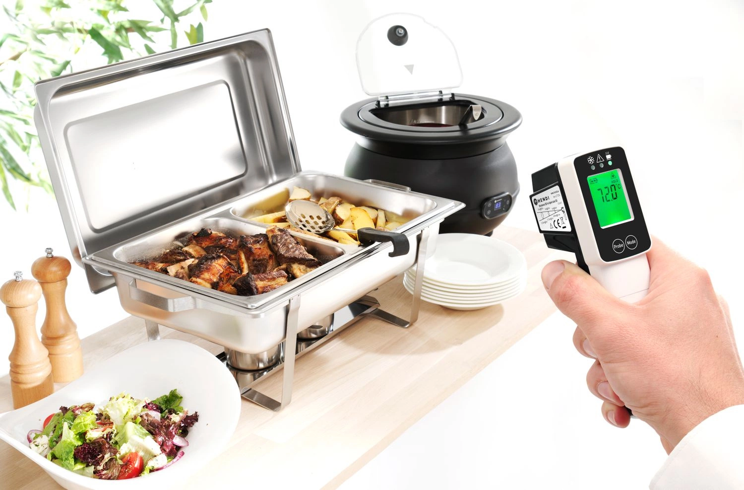 Digitálny infračervený teplomer so sondou HACCP. Teplotný rozsah od -60 do +350°C. Funkcia kontroly HACCP okamžite indikuje bezpečné a nebezpečné teploty pomocou svetelných indikátorov a osvetleného displeja. Automatické vypnutie po 15 s. Výhradne na meranie teploty potravín.
