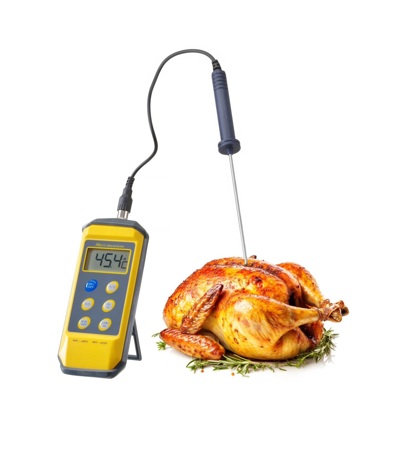 Digitálny teplomer s vymeniteľnou sondou. . Vodotesnosť. Ochranné plastové puzdro. Teplotný rozsah -50 až +300oC. Len na meranie teploty potravín.