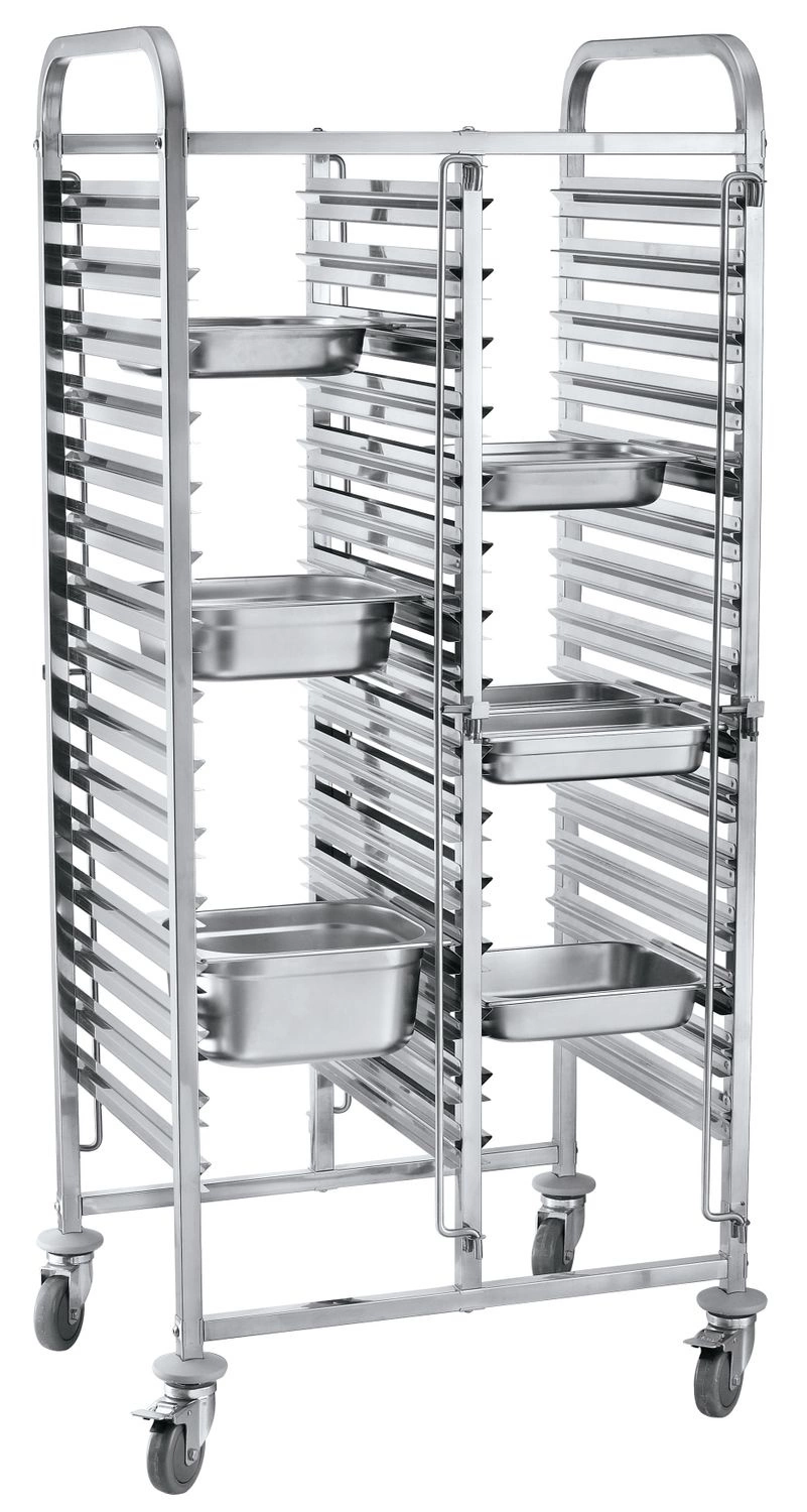Podsedadlový vozík na prepravu kontajnerov GN Vybavený 4 otočnými kolieskami (2 s brzdami). Pojme až 30 nádob GN 1/1 - vzdialenosť medzi policami 80 mm. Kontajner je na oboch stranách zabezpečený proti vysunutiu. Kontajnery sa dajú zasunúť do seba na jednoduché uskladnenie.