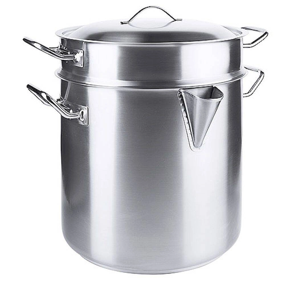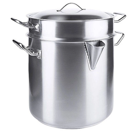 Dvojitý nerezový hrniec CONTACTO bol navrhnutý na každodenné použitie v domácej aj gastronomickej kuchyni. Vďaka dvojitej konštrukcii s priloženou vložkou je možné jednoducho pripravovať jedlá v pare alebo ohrievať pokrmy bez rizika pripálenia. Pevné úchyty zaisťujú pohodlné prenášanie a vyprázdňovanie hrnca, zatiaľ čo tesná nerezová pokrievka umožňuje zachovať arómy a vlhkosť počas varenia.