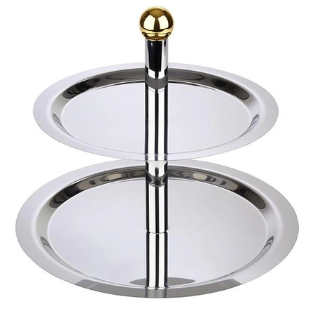Bufetový etažér FINESSE je elegantný, dvojposchodový stojan určený na efektnú prezentáciu občerstvenia, koláčov alebo ovocia na bufetoch, oslavách či počas rodinných stretnutí. Jeho hlavné vlastnosti sú pevná konštrukcia z nehrdzavejúcej ocele a pozlátená mosadzná guľovitá rukoväť, ktorá dodáva celku luxusný charakter a uľahčuje prenášanie.
