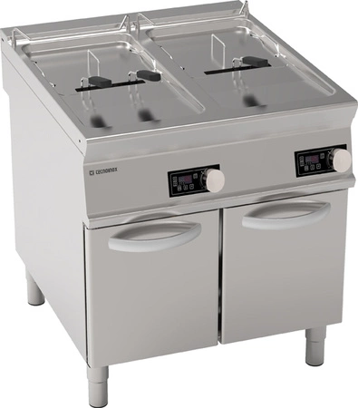 Fritéza ponúka pôsobivý celkový výkon 40 kW, ktorý zaručuje rýchly ohrev a efektívne vyprážanie aj veľkého množstva potravín. Pokročilý elektronický riadiaci systém umožňuje presnú reguláciu teploty v rozmedzí 140-190 °C a zaznamenávanie zvolených prevádzkových programov, čo výrazne zlepšuje každodennú prevádzku a udržiava opakovateľné výsledky. Každá nádrž je vybavená účinnými vykurovacími telesami umiestnenými priamo v komore, ktoré zabezpečujú rovnomerné rozloženie tepla a rýchly čas na dosiahnutie cieľovej teploty.