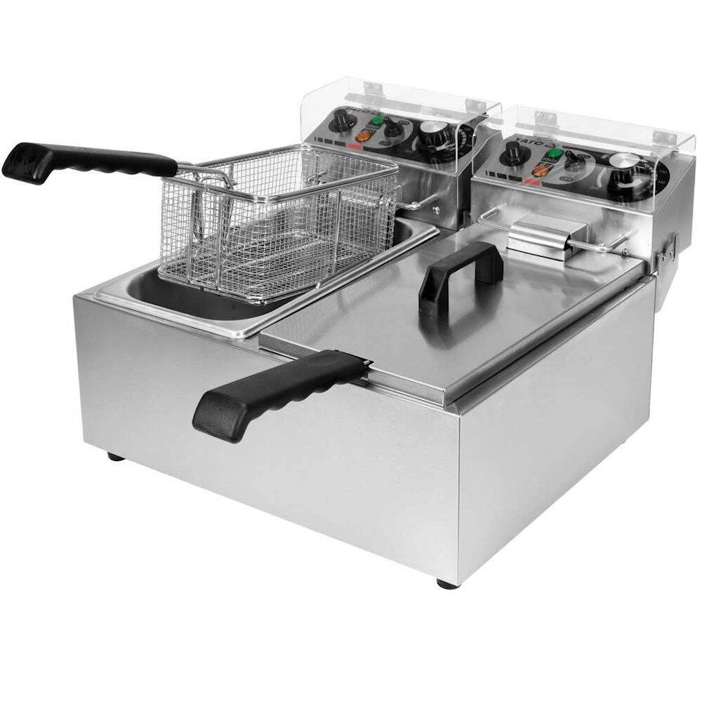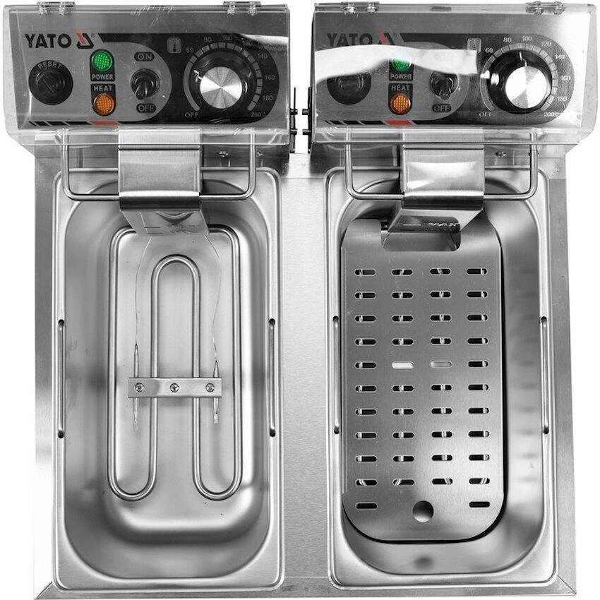 Dvojkomorová fritéza s objemom 2x3,5L značky YATO. Je určená na vyprážanie v hlbokom tuku: hranoliek, mäsa, rýb, krokiet, zeleniny. Nádrže fritézy majú celkový objem 6L. Minimálna hladina oleja je 2,5L a maximálna 3,5L.