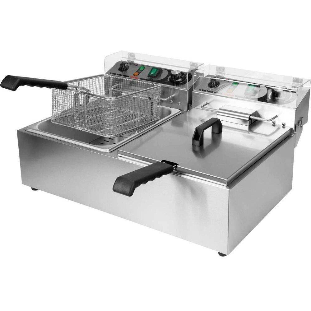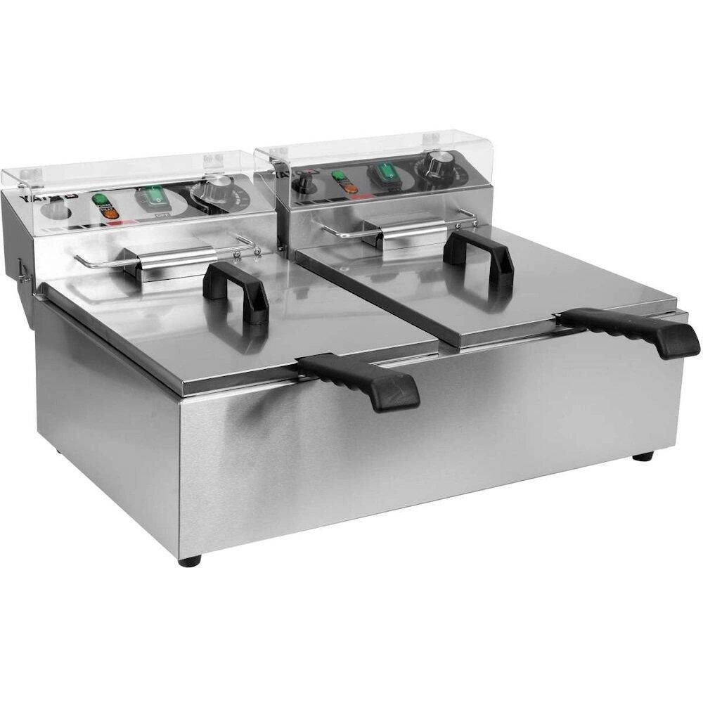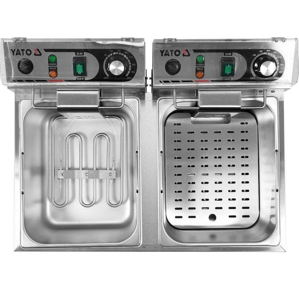 Dvojkomorová fritéza s objemom 2x6L značky YATO. Je určená na vyprážanie v hlbokom tuku: hranoliek, mäsa, rýb, krokiet, zeleniny.Nádrže fritézy majú celkový objem 10L. Minimálna hladina oleja je 4L, maximálna 6L.