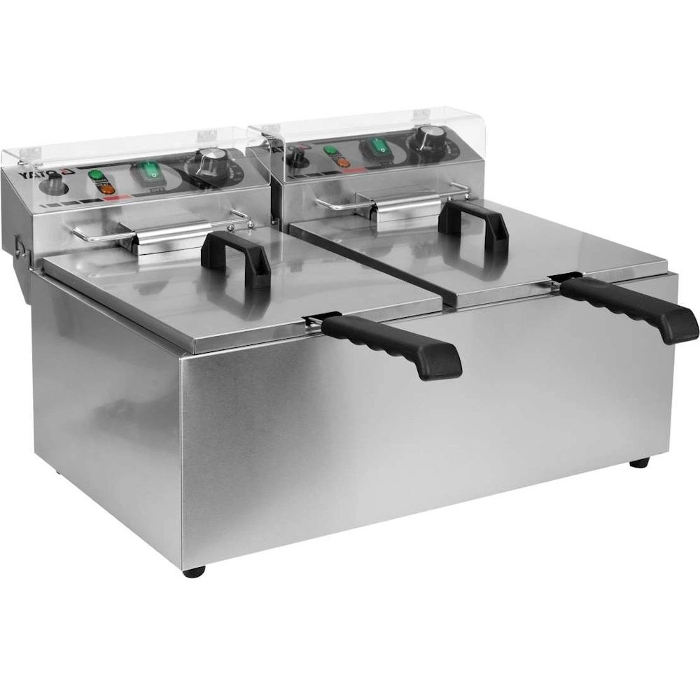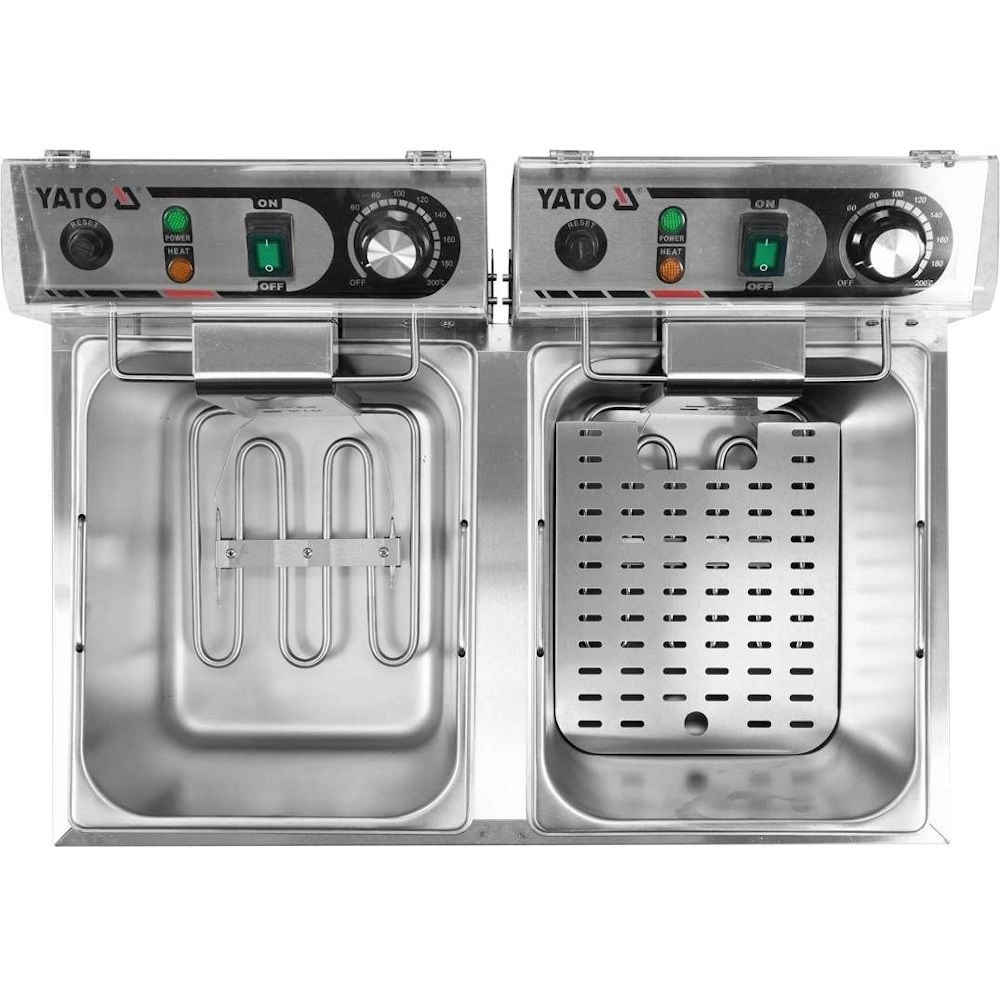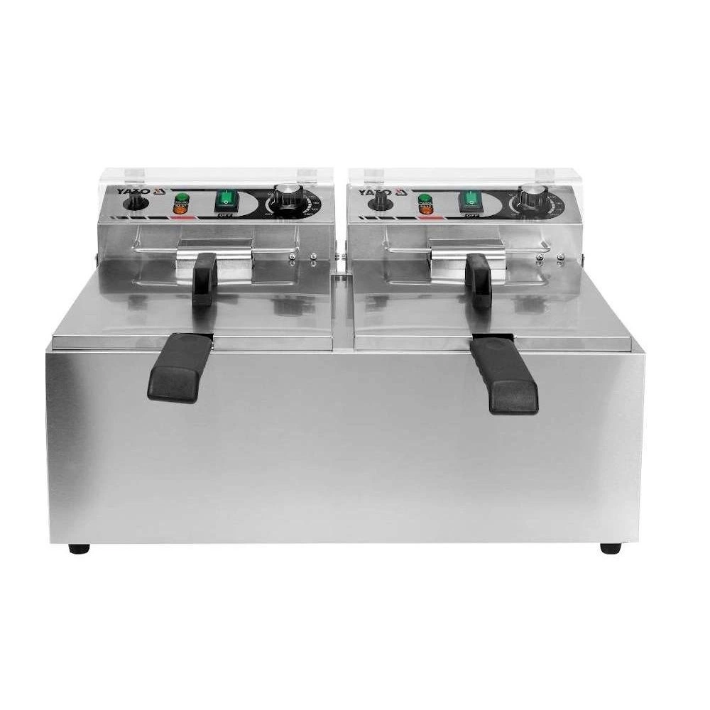 Dvojkomorová fritéza s objemom 2x8L značky YATO. Je určená na vyprážanie v hlbokom tuku: hranoliek, mäsa, rýb, krokiet a zeleniny. Nádrže fritézy majú celkový objem 13L. Minimálna hladina oleja je 5,2L a maximálna 8L.