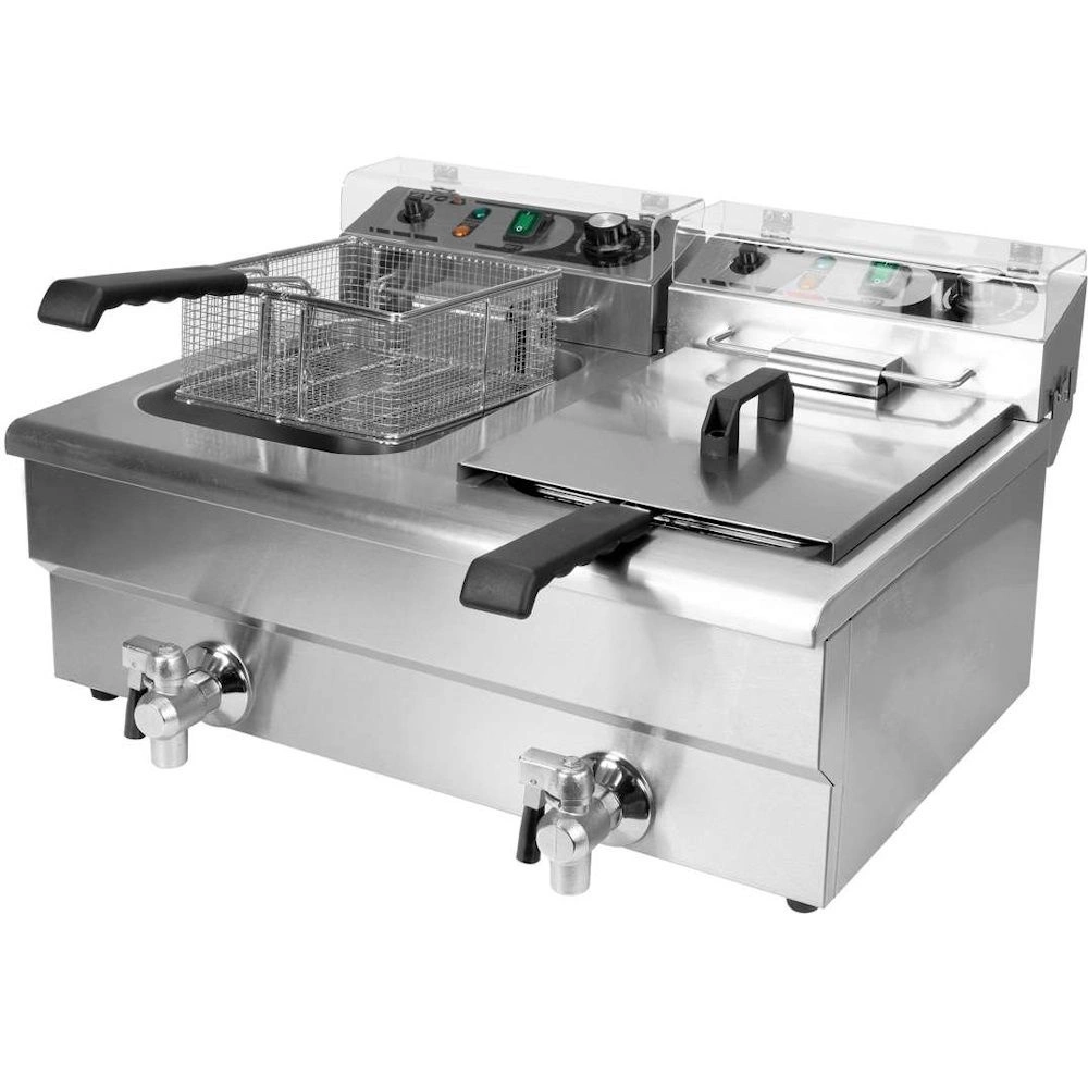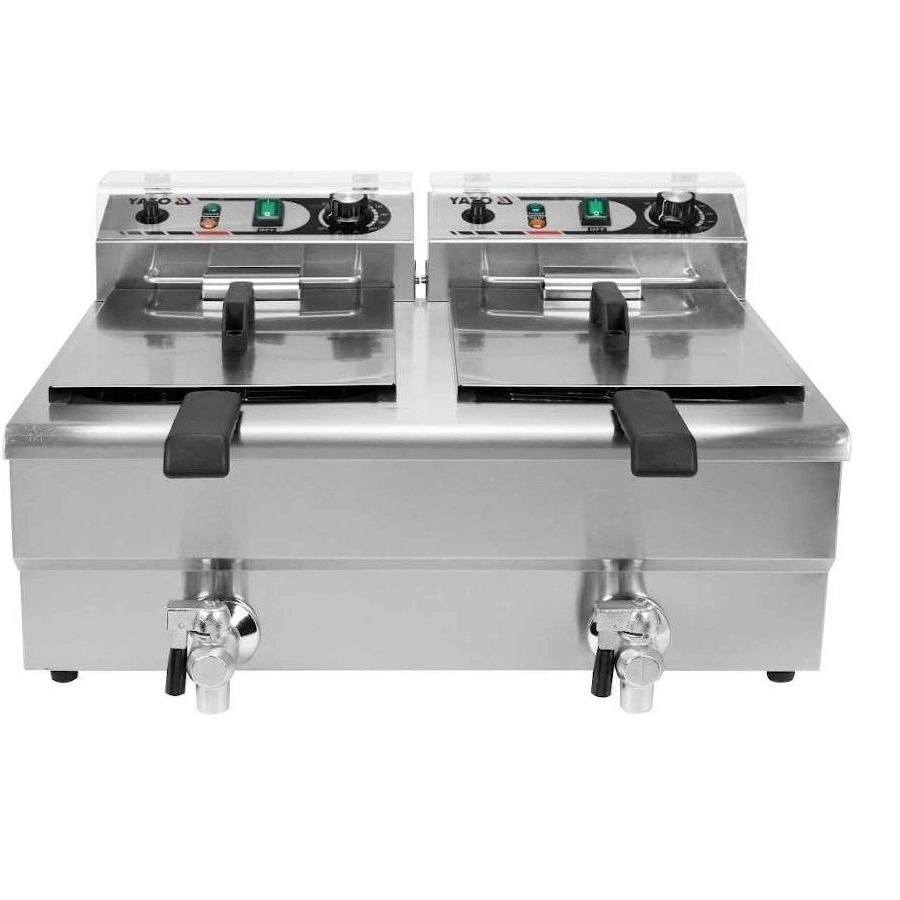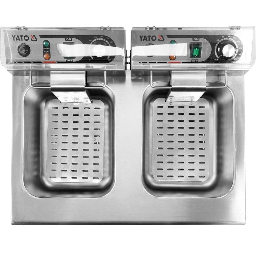 Dvojkomorová fritéza s vypúšťacími kohútikmi s objemom 2x12 značky YATO. Je určená na smaženie v hlbokom tuku: hranoliek, mäsa, rýb, krokiet, zeleniny. Nádrže fritézy majú celkový objem 16L. Minimálna hladina oleja je 9L a maximálna 12L.