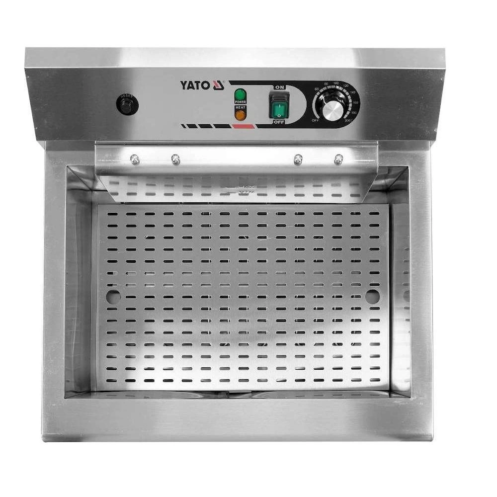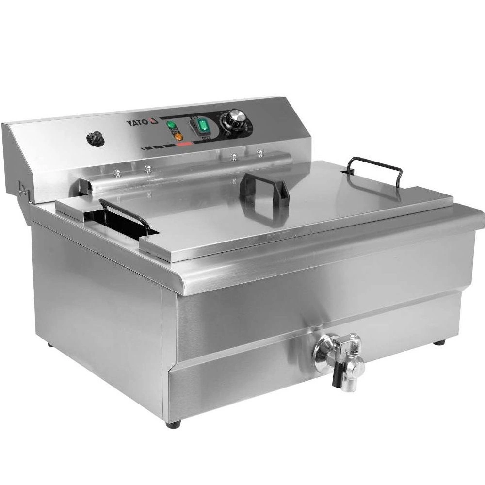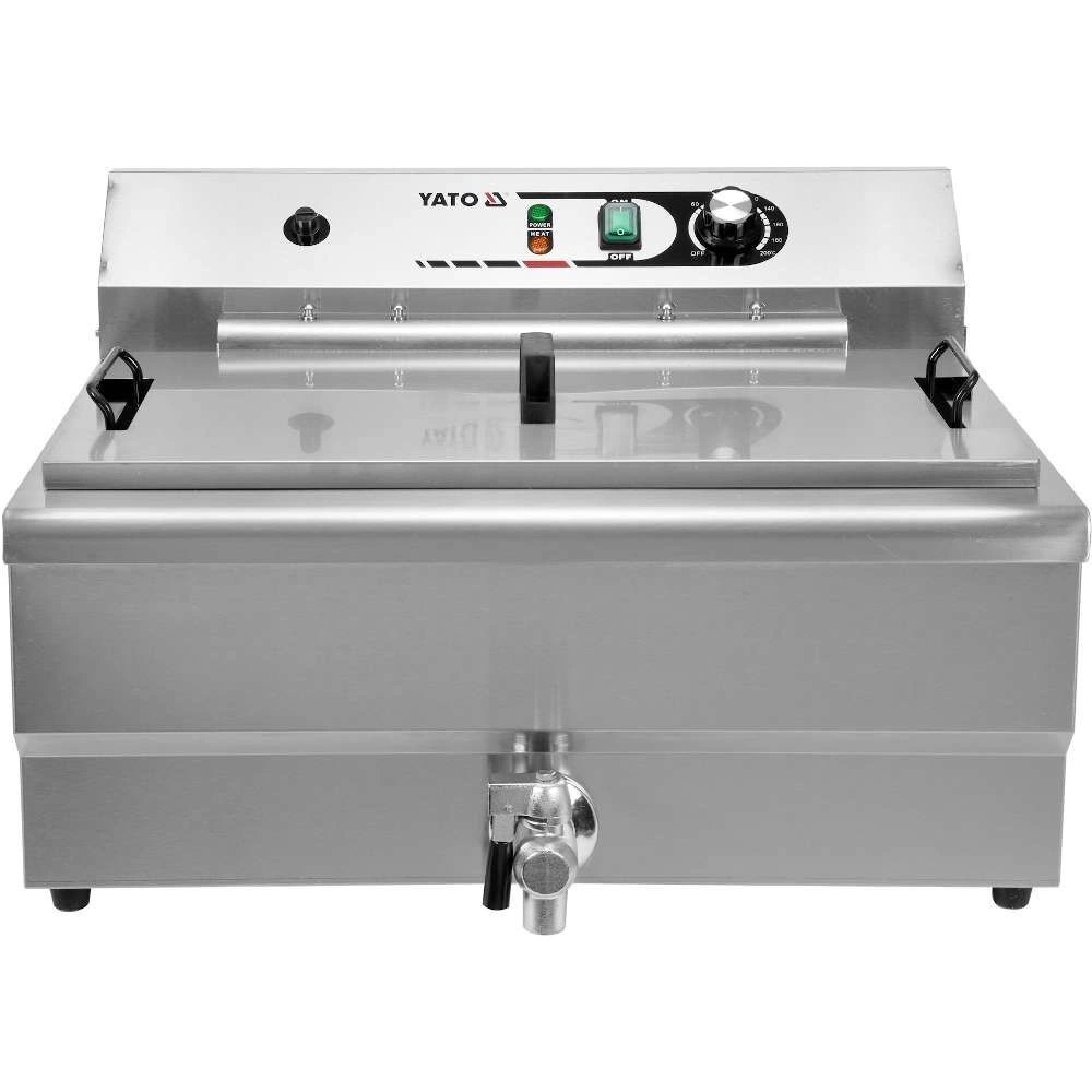 Elektrická fritéza YATO YG-04641 - určená na vyprážanie produktov v hlbokom tuku, napríklad mäsa, rýb, zeleniny, šišiek alebo krokiet. Celkový objem nádoby fritézy je 35 l – minimálna hladina oleja je 21 l a maximálna 26,5 l. Fritéza má ohrievač s výkonom 6,0 kW, ktorý sa ovláda potenciometrom umiestneným na ovládacom paneli. Pracovná teplota 60oC -200oC. Vďaka striekajúcemu vypínaču je možné zariadenie vypnúť bez nutnosti odpojenia napájacieho kábla zo siete.