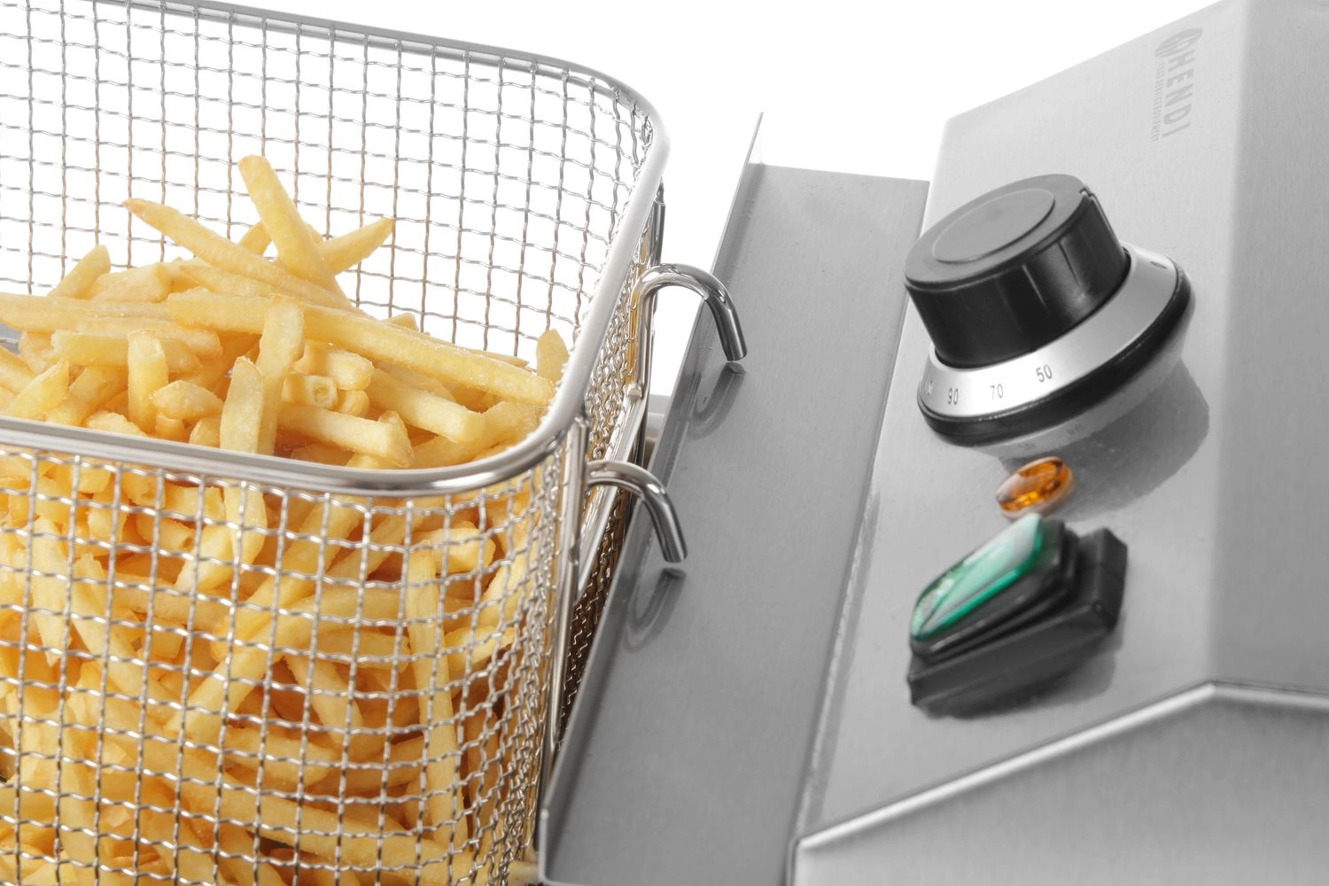 Elektrická fritéza Master Cook s objemom 8 l. Dizajn -  chrómová oceľ. Fritéza je určená na profesionálne stravovanie. Je ideálna nielen na vyprážanie hranolčekov, ale aj na fritovanie klobás, rýb, krokiet, mäsa atď. Konštrukcia komory zabezpečuje zachovanie tzv. studenej zóny, ktorá chráni pred pripálením drobných zvyškov výrobkovów. Termostat s kontrolkou chráni fritézu pred prehriatím. Termostat je zároveň možné opätovne spustiť pomocou tlačidla reštartu v spodnej časti fritézy.  Rukoväť na zavesenie koša umožňuje vysypanie pripravených výrobkov aacute;z fritézy. Regulácia teploty až do 195ºC pomocou gombíka.