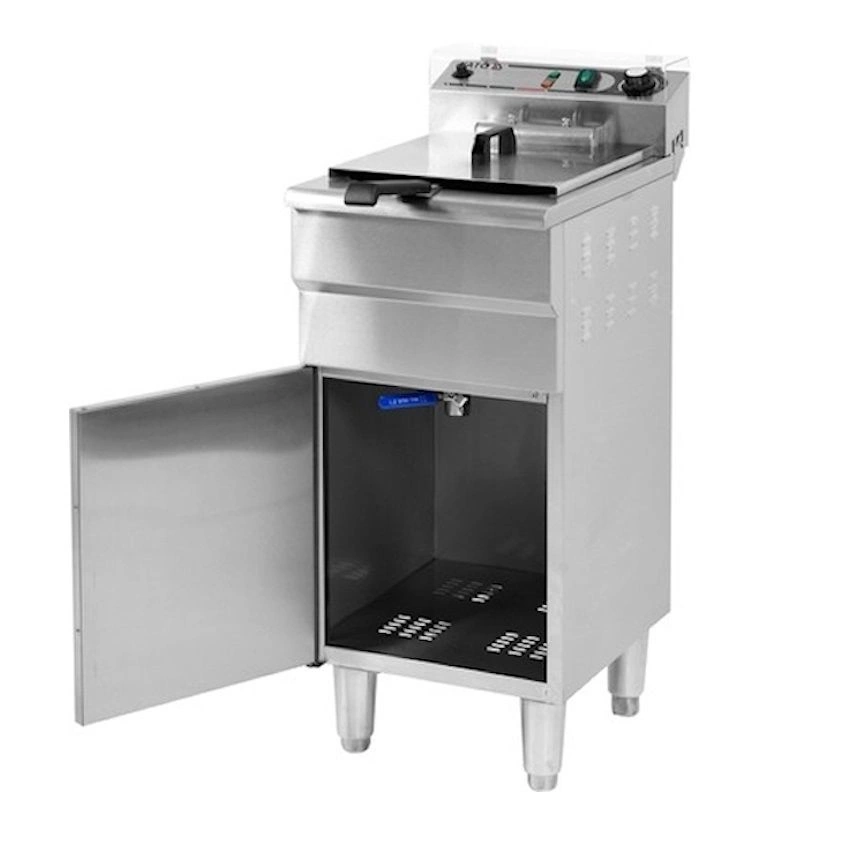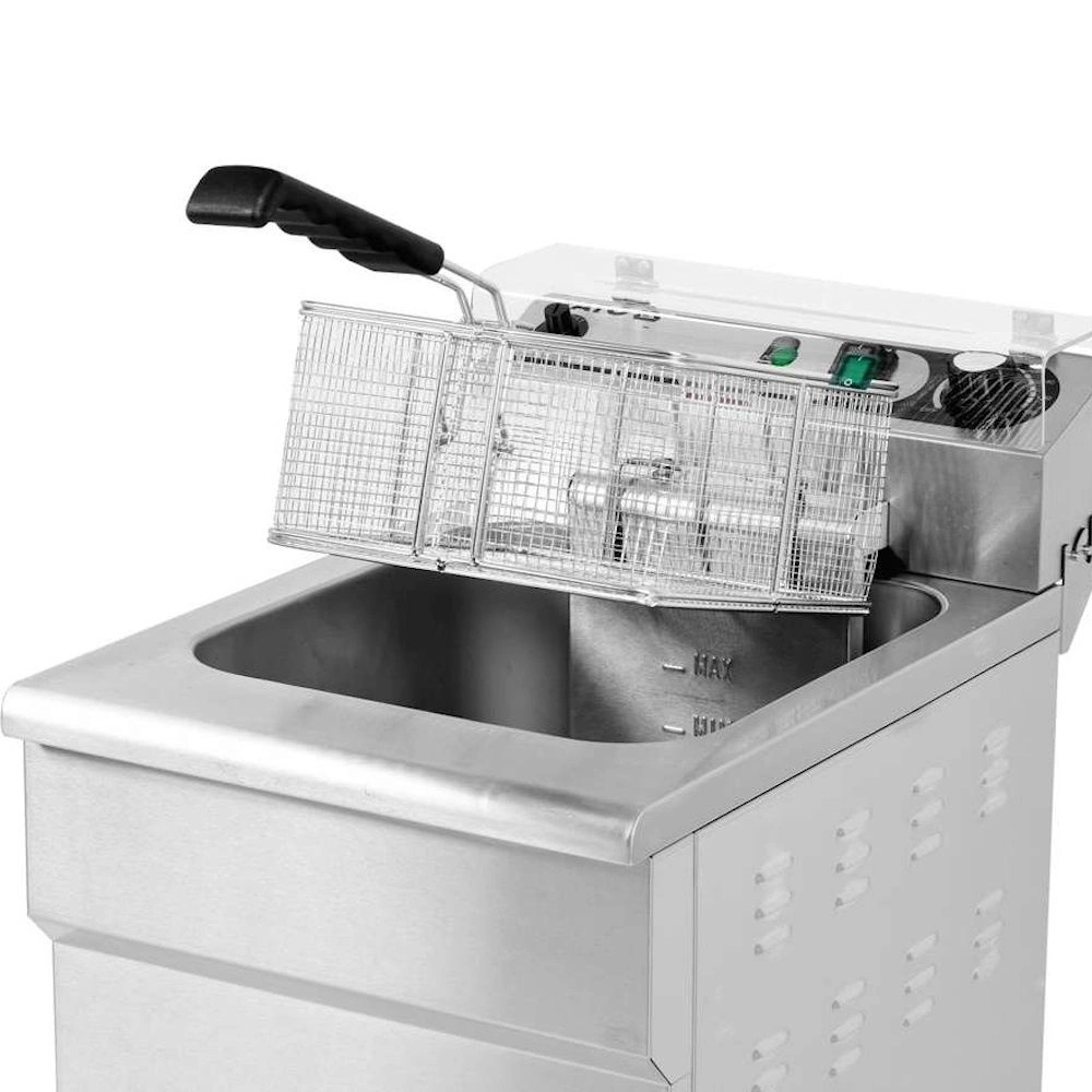 Ohrievač s výkonom 5 kW je ovládaný pomocou potenciometra umiestneného na ovládacom paneli. Je možné nastaviť pracovnú teplotu v rozsahu 60~200℃. Nainštalovaný striekajúci vypínač umožňuje vypnúť zariadenie bez potreby odpojenia napájacieho kábla zo siete. Ovládací panel je navyše vybavený ochranným krytom z veľmi odolného polykarbonátu, ktorý chráni panel pred postriekaním olejom počas vyprážania. Vďaka tomu je udržiavanie fritézy v čistote oveľa jednoduchšie. Vyberateľný ohrievač je možné zavesiť na špeciálny držiak v polohe, v ktorej odkvapkávajúci olej steká späť do nádrže. Fritéza má dodatočnú ochranu, ktorá automaticky vypne ohrievač pri jeho vybratí z nádrže. Ďalšia ochrana chráni zariadenie pred prehriatím pri teplote nad 260℃.