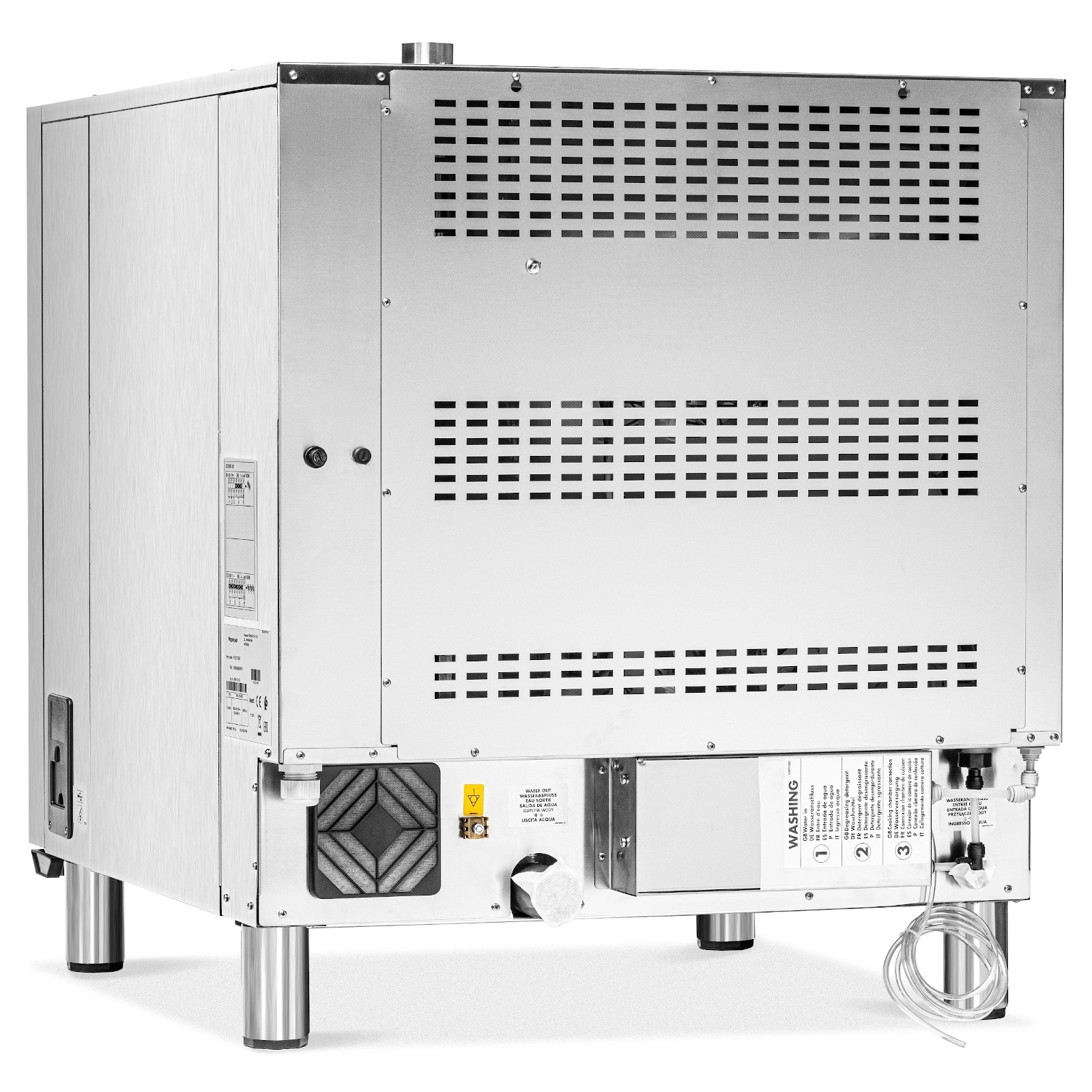 Zariadenie je vyrobené z vysokokvalitnej nehrdzavejúcej ocele AISI 304, čo zaručuje odolnosť proti korózii a jednoduchú údržbu. Komora s lisovaným vnútrom a zaoblenými rohmi umožňuje rýchle umývanie a odtok v dne účinne odvádza prebytočné tekutiny. Dvere s dvojitým zasklením a gravitačným chladením zvyšujú bezpečnosť a komfort používania, minimalizujú riziko popálenia. Rúra je vybavená systémom automatického chladenia komory, čo umožňuje bezpečnú a rýchlu zmenu režimu, ako aj USB portom na aktualizáciu softvéru a správu receptov.