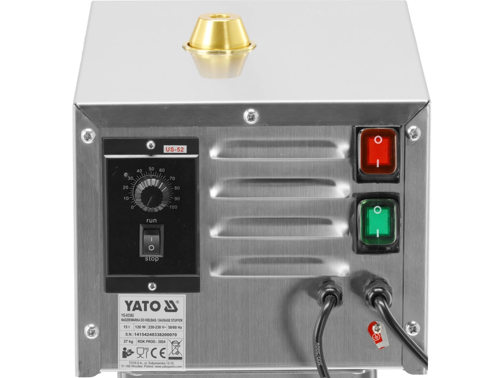 Elektrická plnička klobás YATO YG-03382 s objemom 15 litrov je spoľahlivé zariadenie pre stravovacie zariadenia, prevádzky na spracovanie mäsa a domácnosti. Je vyrobený z vysokokvalitnej nehrdzavejúcej ocele, zaručuje odolnosť a jednoduchú údržbu čistoty vďaka možnosti demontáže nádrže a prvkov prichádzajúcich do kontaktu s potravinami.