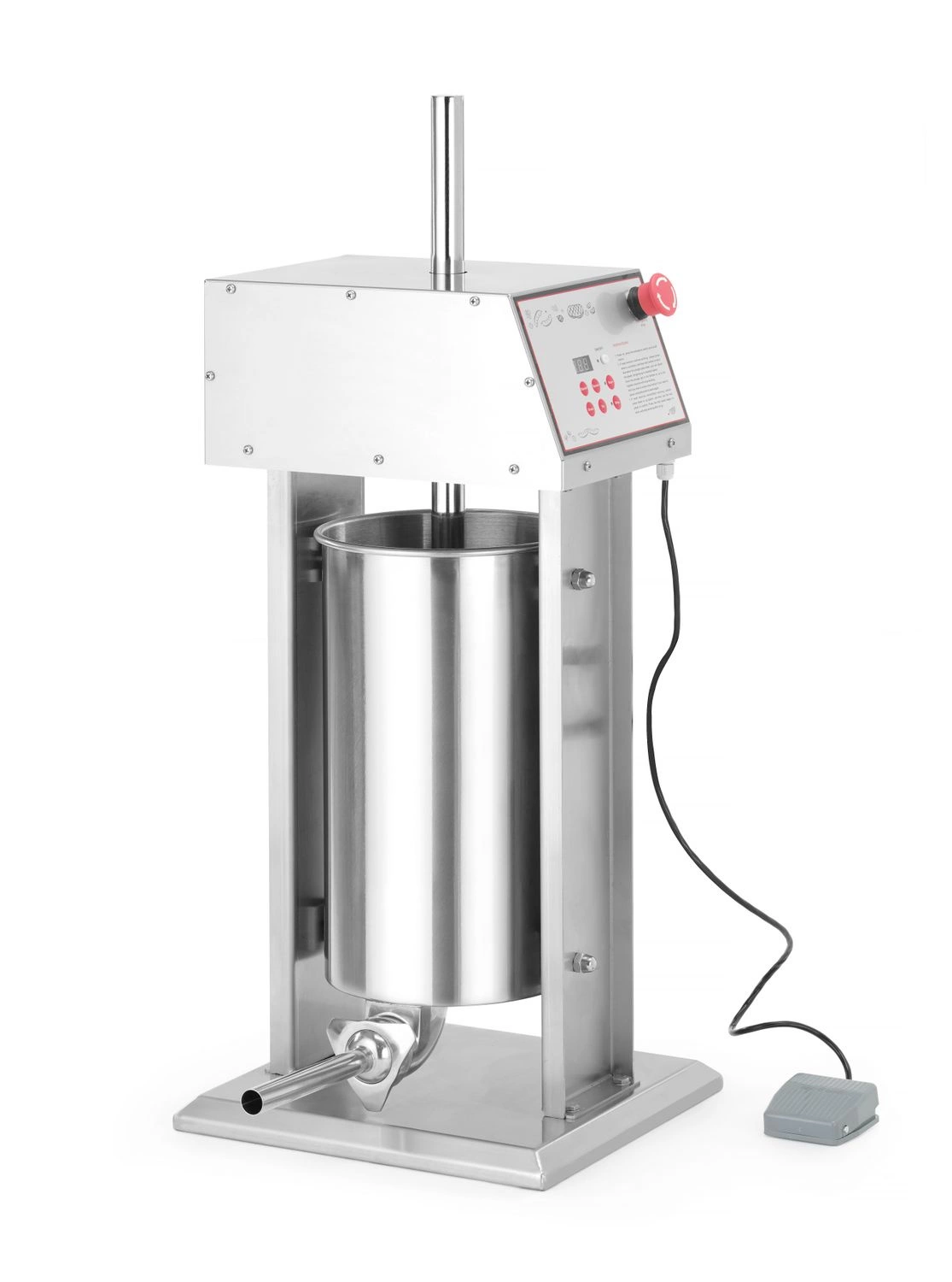 Elektrická vertikálna plnička klobás  s objemom 15 litrov. Vyrobený z nehrdzavejúcej ocele. 4 lieviky s priemermi 16, 22, 32 a 38 mm, ktoré umožňujú prípravu klobás rôznej hrúbky.