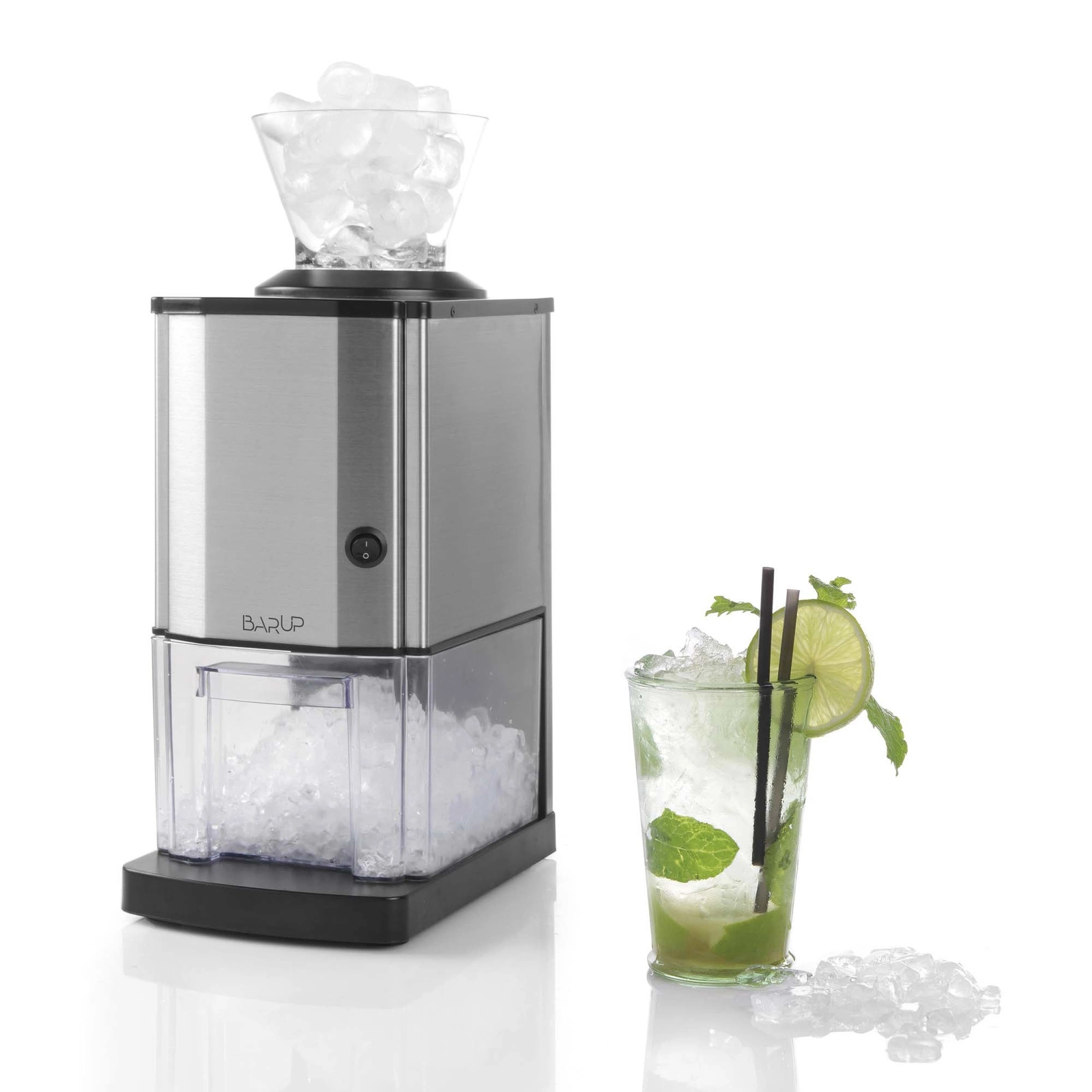 Kompaktný drvič ľadu s kapacitou až 12 kg/hod. Stroj sa odporúča pre veľké a malé stravovacie zariadenia, ale možno ho použiť aj v domácnosti. Široký žľab na ľad vyrobený z ABS plastu. Kryt vyrobený z brúsenej nehrdzavejúcej ocele. Nože z nehrdzavejúcej ocele a robustný drviaci mechanizmus. Priehľadná nerozbitná nádoba s maximálnou kapacitou 12 šálok drveného ľadu.