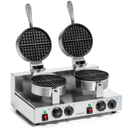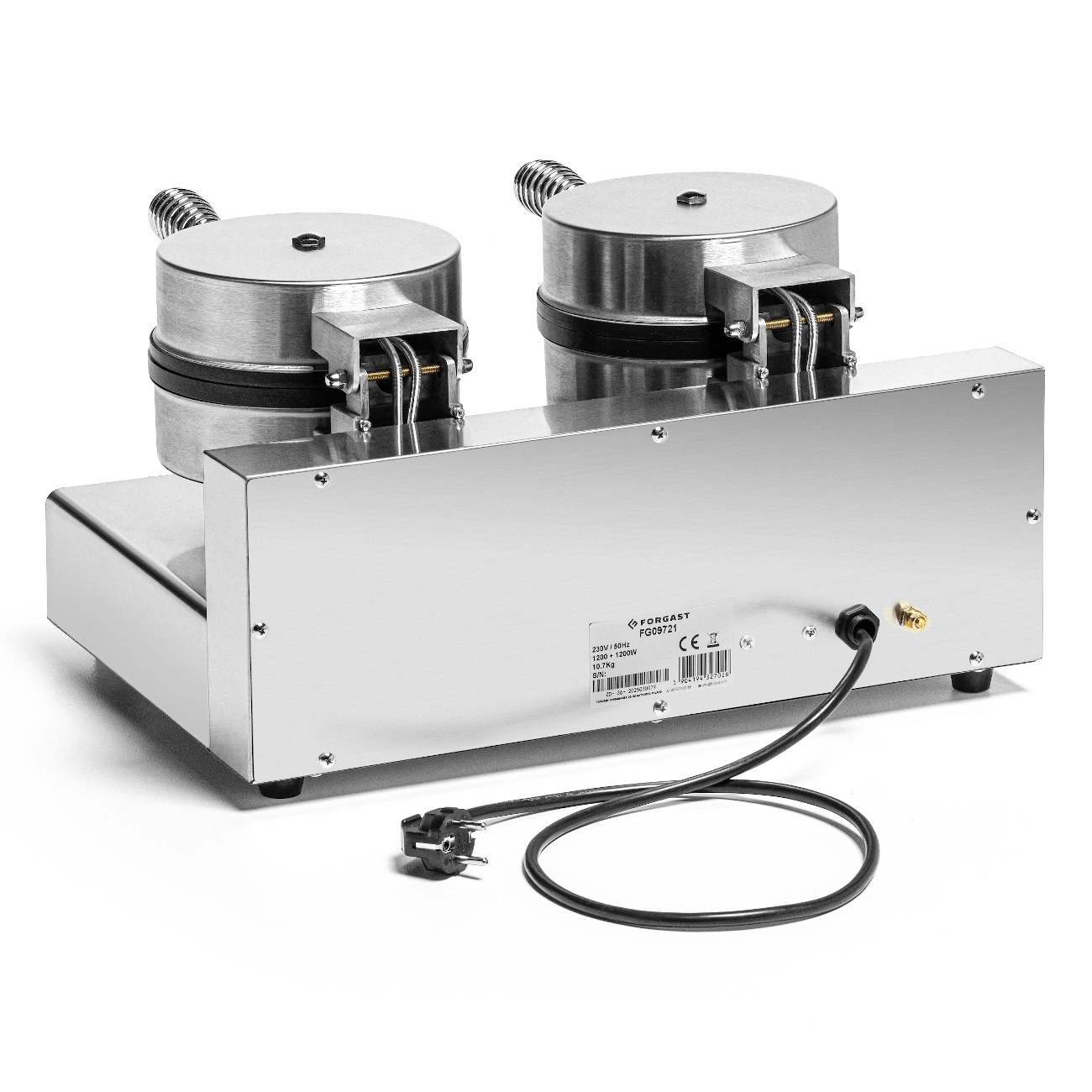 Profesionálny elektrický vaflovač Forgast FG09721 je odolné zariadenie určené na intenzívne použitie v gastronomickom sektore. Umožňuje súčasnú prípravu dvoch veľkých, okrúhlych belgických vaflí. Vyznačuje sa vysokým výkonom a širokým rozsahom regulácie teploty, čo umožňuje presné nastavenie parametrov pečenia podľa rôznych receptúr a požiadaviek zákazníkov. Ideálny do kaviarní, food truckov, hotelových bufetov aj sezónnych stánkov.