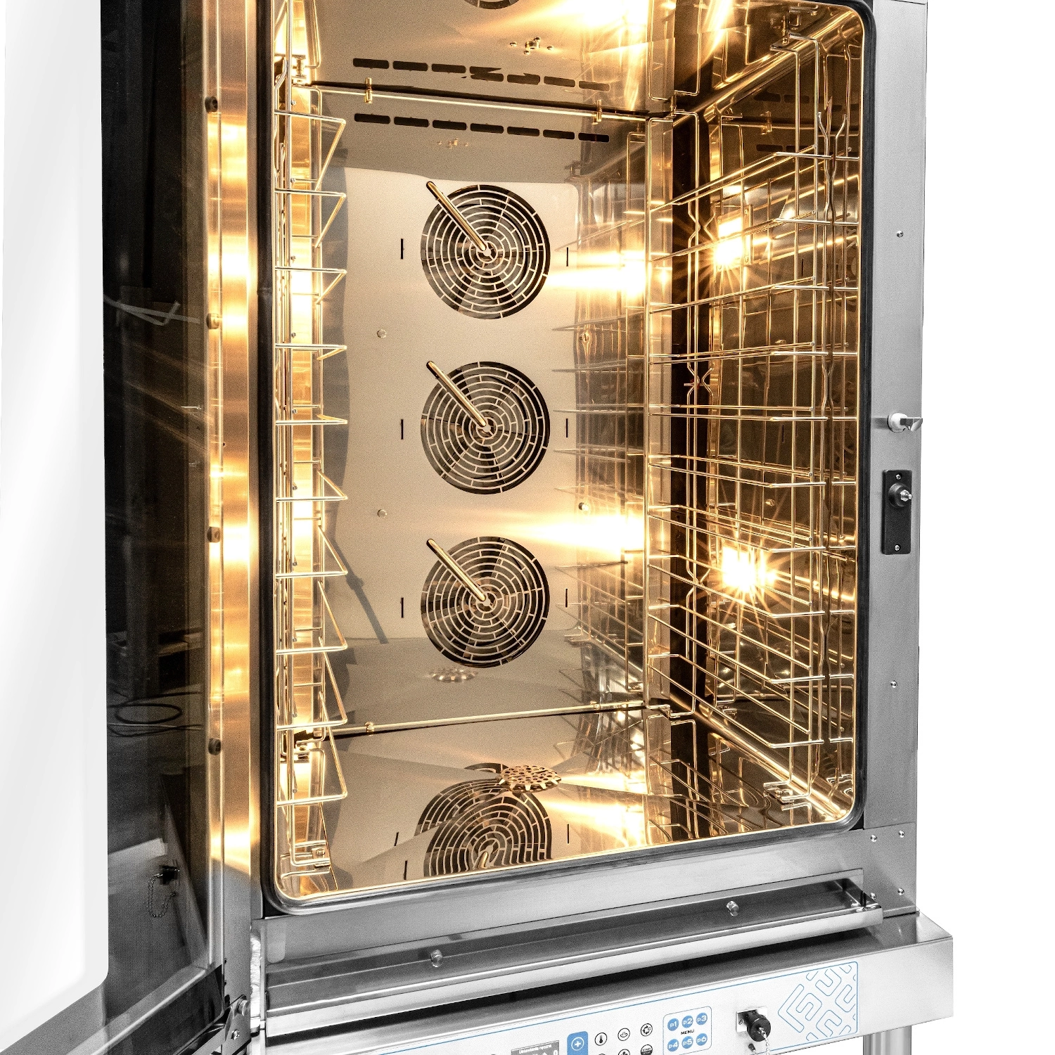 • Kapacita náplne: 10 x GN 1/1 alebo 10 x plech 60x40 cm – umožňuje súčasnú prípravu veľkého množstva jedál, čo je mimoriadne užitočné v zariadeniach s vysokou prevádzkou.