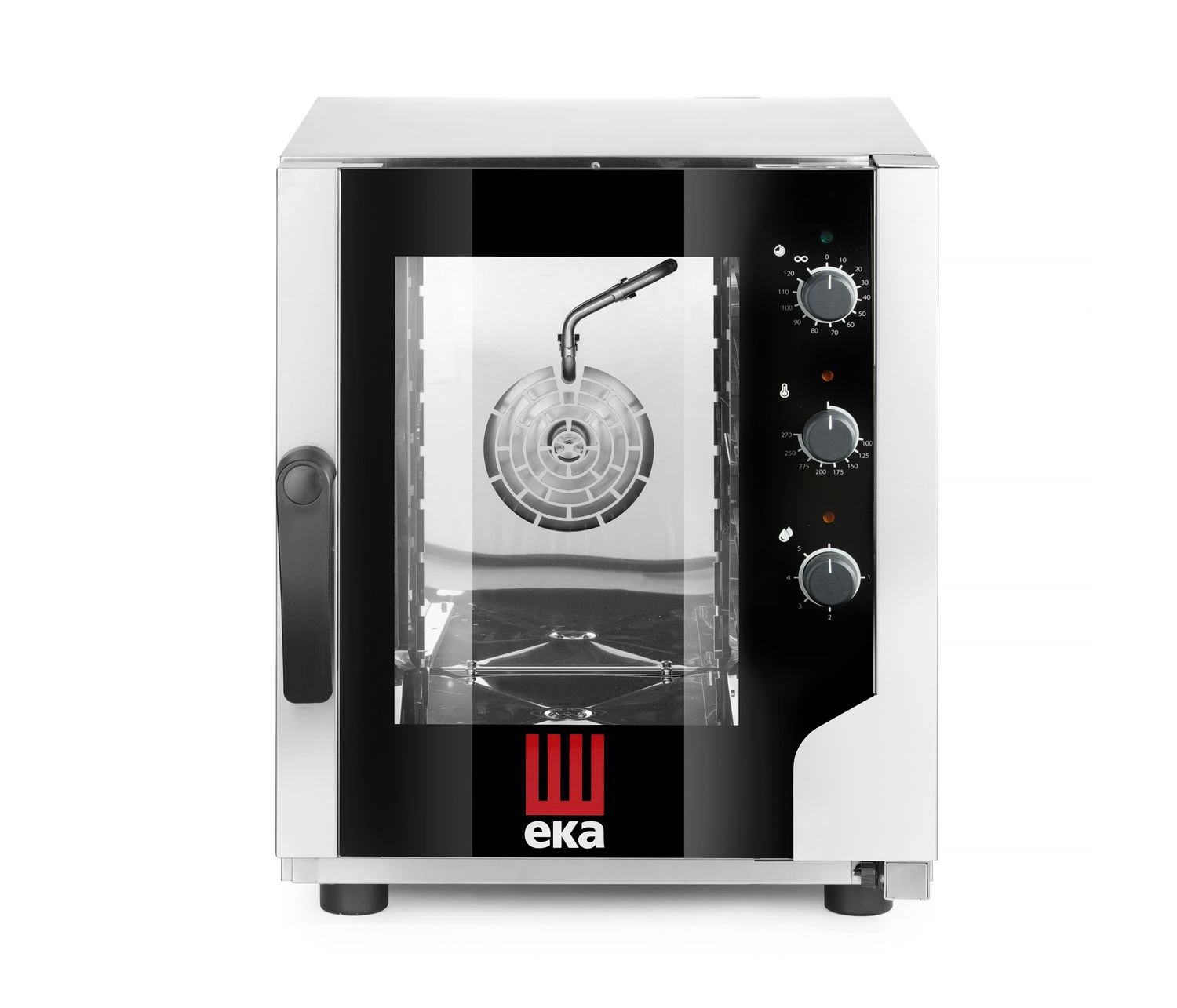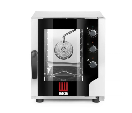 Evolution Nový kombinovaný parný stroj 5xGN 2/3. Manuálne ovládanie, možnosť nastavenia: teploty, času pečenia a úrovne pary. Para sa vytvára priamym striekaním vody na ventilátor. 5 stupňov regulácie pary v rozsahu 0-100 %. Rozsah teplôt 100-270oC. Teplota v komore sa reguluje termostatom. Odnímateľné vodiace lišty pre GN nádoby a žiaruvzdorné okno s dvojitým sklom a tesnením. Spotrebič má kontrolky rôznych funkcií a časovač na 0-120 minút. Komora rúry je vyrobená z vysoko kvalitnej nehrdzavejúcej ocele AISI 304.