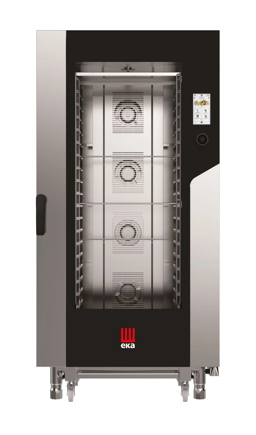 Elektrická kombinovaná parná rúra Gastro s dotykovou obrazovkou Millenial. Je vhodná až pre 20 plechov GN 1/1. Rúra má 7-palcový farebný a dotykový ovládací panel, ktorý umožňuje presné nastavenie parametrov pečenia. Funkcia Airflowlogic je riešenie, ktoré zlepšilo cirkuláciu vzduchu ventilátora vďaka prepracovanému dizajnu odsávača pár. Humilogic je nový zvlhčovací systém, ktorý privádza vodu priamo z ventilátora. Tým sa zabezpečuje vysoká úroveň vlhkosti, ktorá znižuje spotrebu vody. Drylogic je tiež inovatívny systém. Ventilór riadený počítačom kontroluje výmenu vzduchu v komore a odstraňuje nadmernú vlhkosť. Teplota vo vnútri vareného výrobku sa meria pomocou bodovej sondy. Viacúrovňové varenie umožňuje súčasnú prípravu rôznych jedál, ktoré si vyžadujú rovnaké podmienky, ale rôzny čas varenia. Rúra vás informuje o tom, kedy je potrebné jedlo vybrať. Predohrev ohrieva komoru rúry na 30 stupňov, zatiaľ čo Cooldown komoru ochladí, aby sa mohol začať ďalší proces varenia. Systém čistenia je automatický so 4 programami čistenia: Eco, Normal, Intenzívne, Oplachovanie. Nádoba USB uľahčuje nahrávanie nových receptov na varenie a údajov HACCP. Ideálne funguje aj ako rozmnožovacia komora a banketka. Do kuchárskej knihy sa zmestí až 500 receptovóv 10 krokochókaždý. Regulácia teploty od 30 stupňov;C-270 stupňov;C.