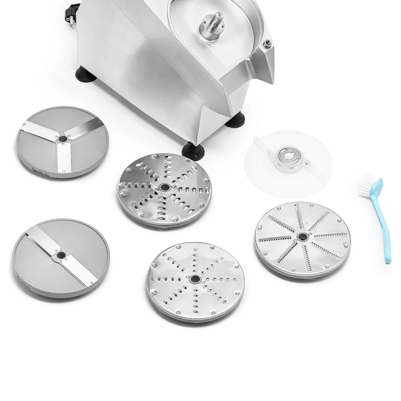 • Sada kotúčov v balení – priložené kotúče umožňujú krájanie zeleniny na strúhané kúsky s hrúbkou 3 mm, 5 mm a 7 mm a na plátky s hrúbkou 2 mm a 4 mm, čo umožňuje pripraviť suroviny na rôzne jedlá, od šalátov po zapekané pokrmy.