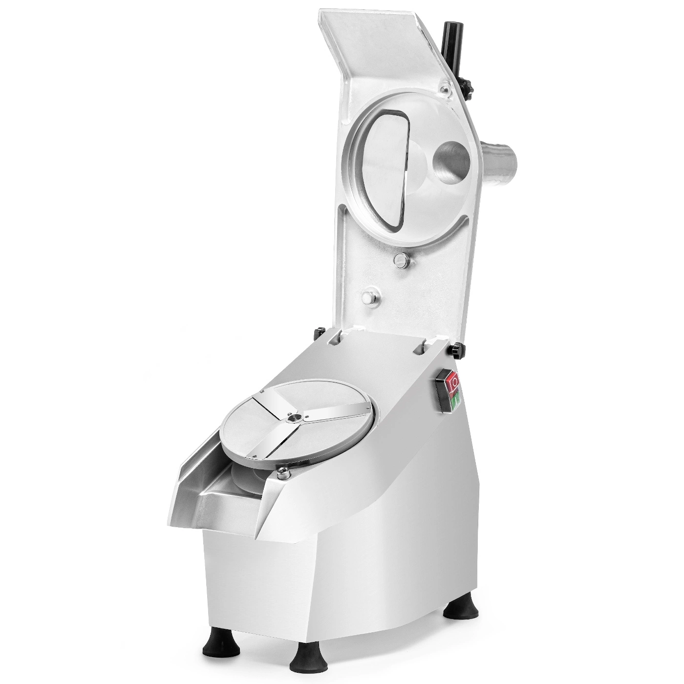 Elektrický krájač zeleniny je vybavený dvoma rôznymi podávacími otvormi – oválnym, určeným na väčšiu zeleninu, ako sú zemiaky alebo kapusta, a okrúhlym, valcovým, ideálnym na dlhšie a jemnejšie produkty, napr. mrkvu alebo uhorky. Vďaka tomu zariadenie umožňuje pohodlné a rýchle spracovanie rôznych druhov zeleniny bez potreby ich predchádzajúceho krájania, čo je kľúčové v profesionálnych kuchyniach, kde záleží na každej minúte práce.