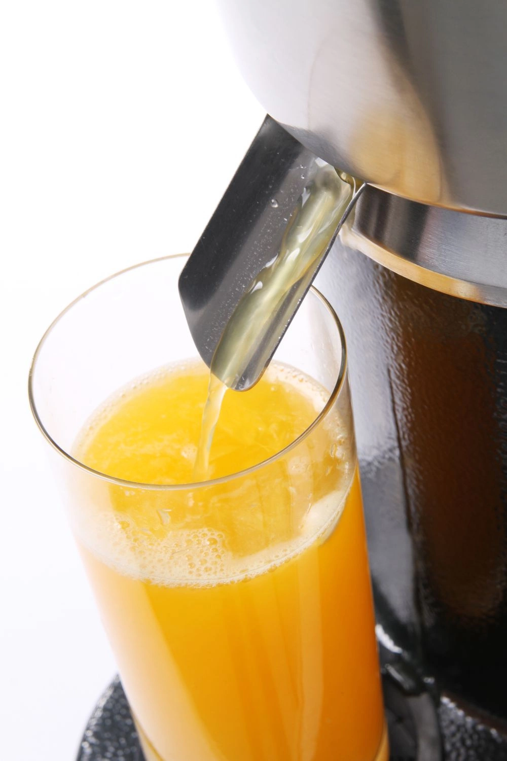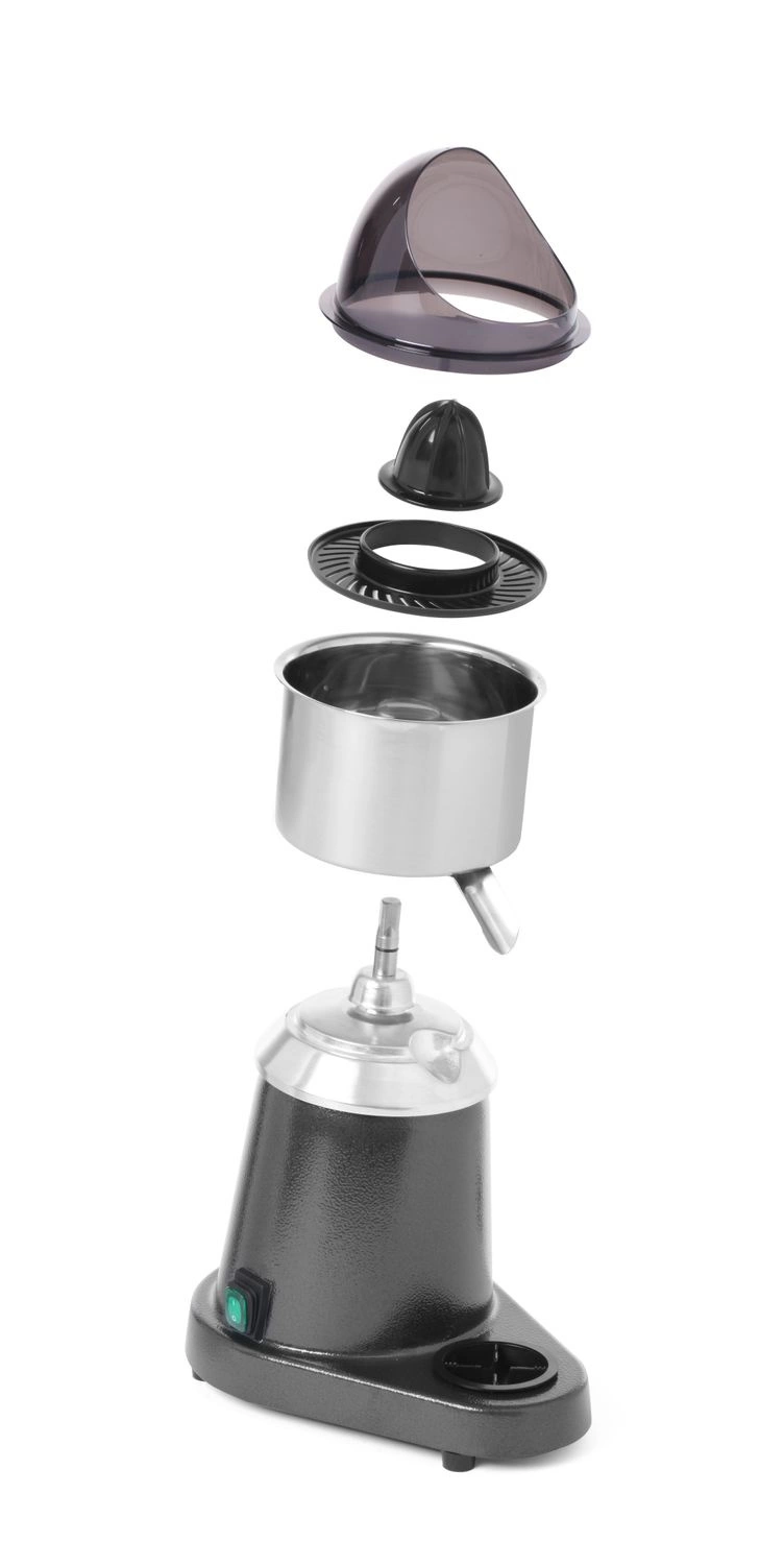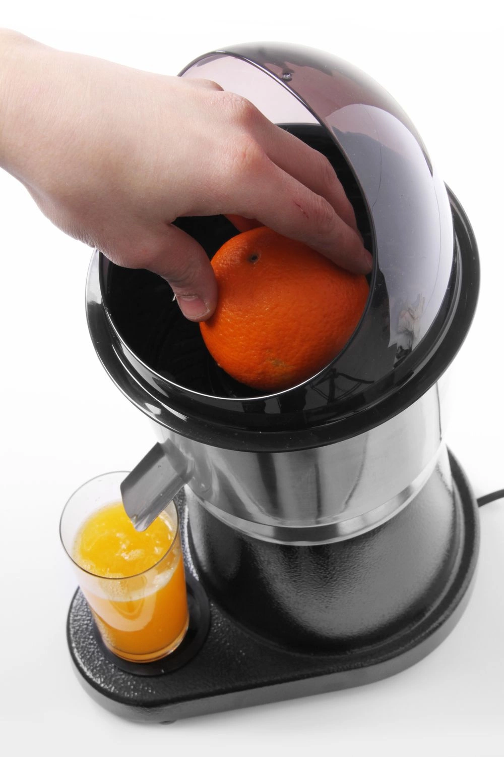 Elektrické lis na citrusové plody. . Kryt zariadenia je vyrobený z materiálu odolného voči korózii, zatiaľ čo pracovná časť (nádoba) je vyrobená z nehrdzavejúcej ocele. Obsahuje 3 plastové stláčacie podložky. Obrazovka je vyrobená z plastu. Extrúder sa ľahko používa. Ovláda sa tlačidlom zapnutia/vypnutia. Ochrana proti striekajúcej vode.