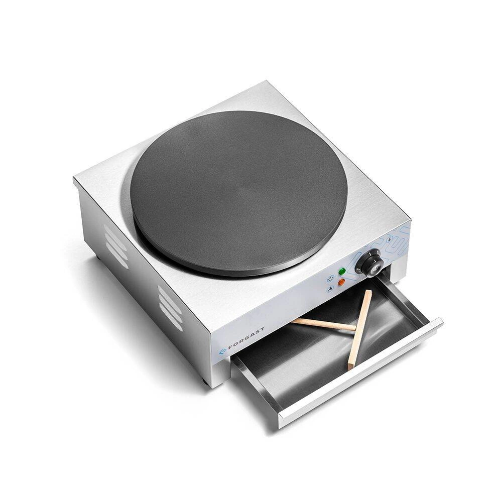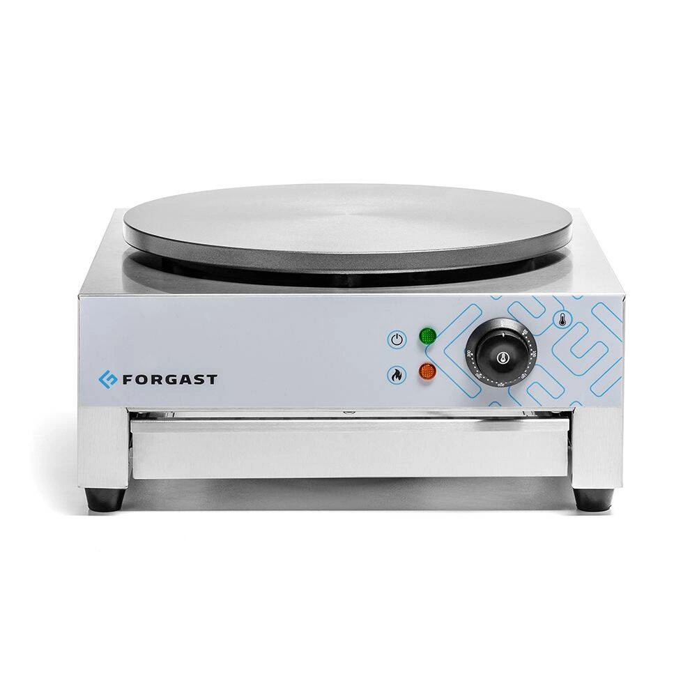 Elektrická palacinkovač FORGAST FG09100 je profesionálne zariadenie určené na prípravu palaciniek v gastronomickom prostredí. Vyznačuje sa pevnou konštrukciou z nehrdzavejúcej ocele a veľkou liatinovou platňou s nepriľnavým povrchom. Je vynikajúcou voľbou pre reštaurácie, kaviarne, food trucky a gastronomické prevádzky, kde záleží na výkonnosti a jednoduchosti obsluhy.