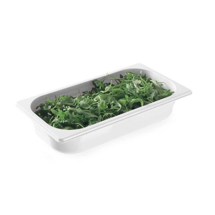 GN kontajner 1/4 s hĺbkou 10 cm z bieleho polykarbonátu. Neabsorbuje chute ani pachy. Odolný voči teplotám od -40 do +99oC.