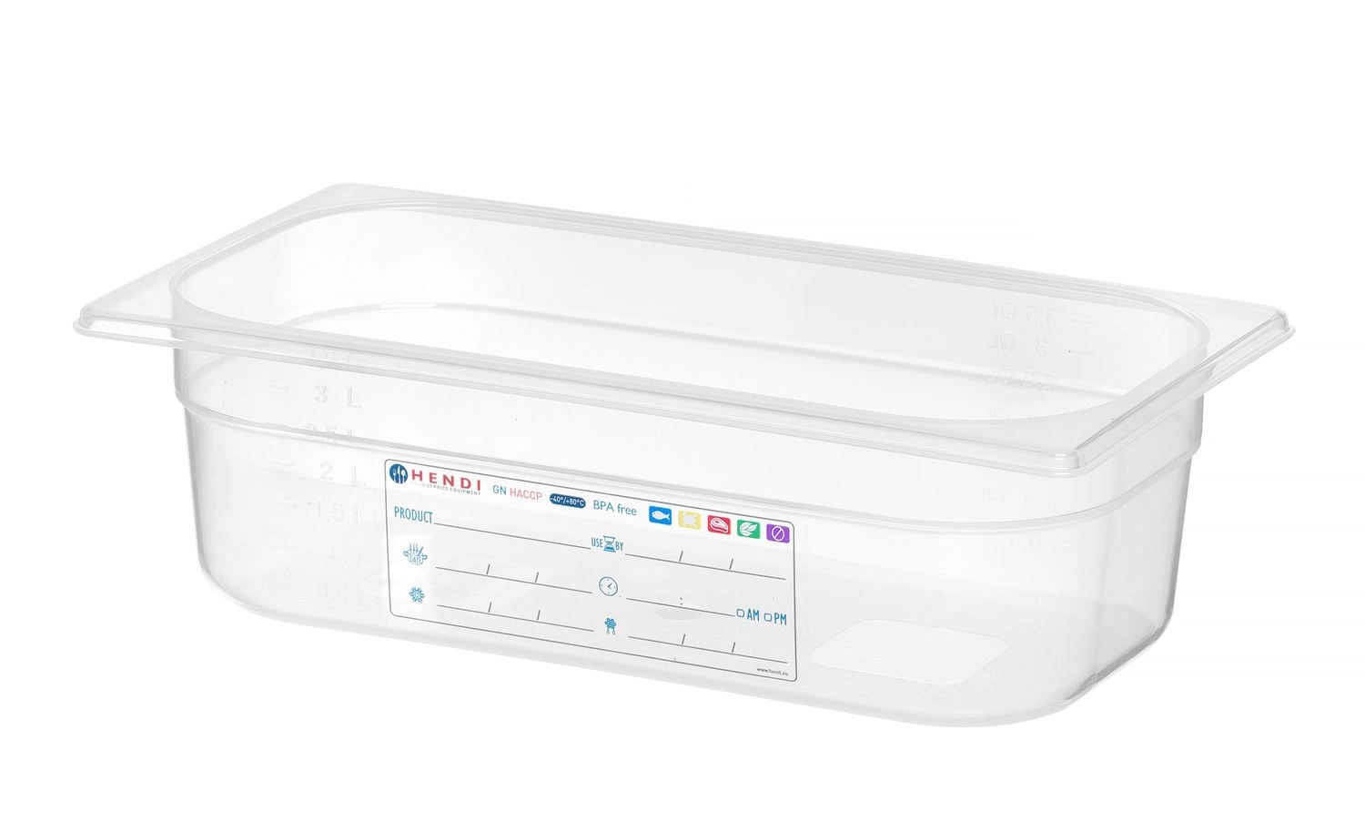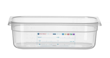 GN 1/3 HACCP kontajner s hĺbkou 10 cm z priehľadného polypropylénu. Vložený štítok na monitorovanie procesu skladovania. Neabsorbuje pachyóani chuteó.