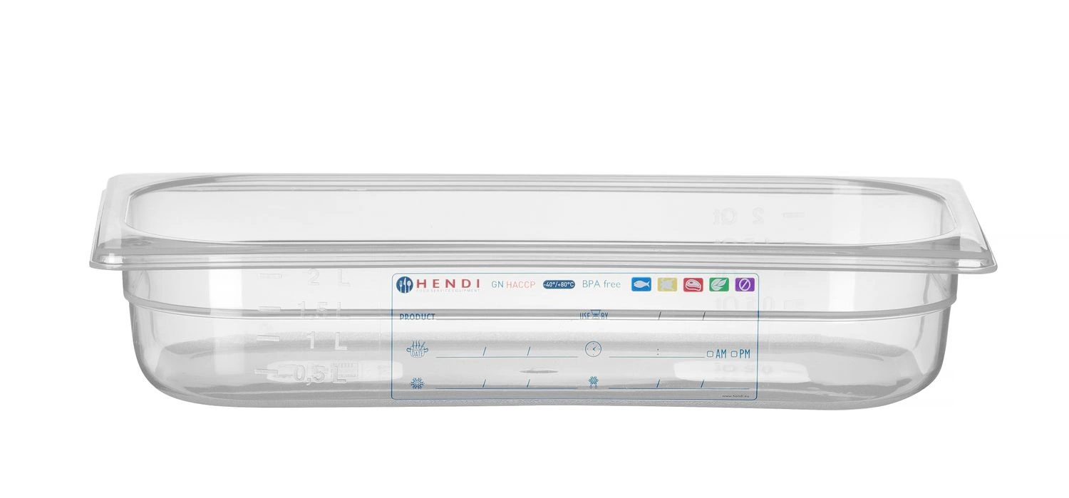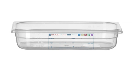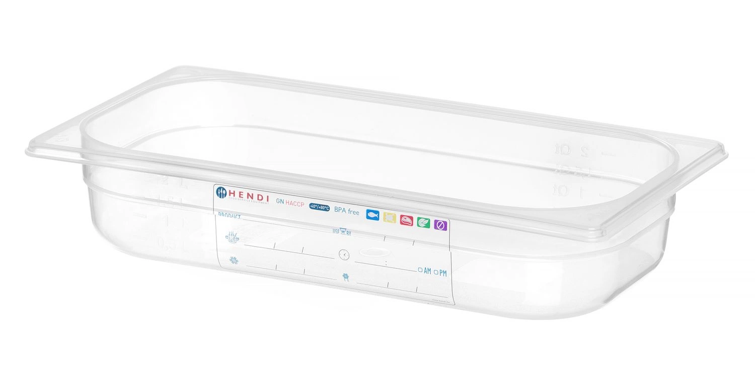 GN 1/3 kontajnera HACCP s hĺbkou 6,5 cm z priehľadného polypropylénu. Vlisovaný štítok na monitorovanie procesu skladovania. Neabsorbuje pachyóa príchuteóa.