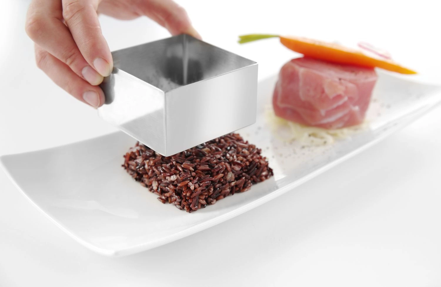 Formy na varenie a cukrovinky bez lisovacieho nástroja  s rozmermi 8x8x4,5 cm. Vyrobené z nehrdzavejúcej ocele. Ideálna na tvarovanie koláčov a pokrmov.