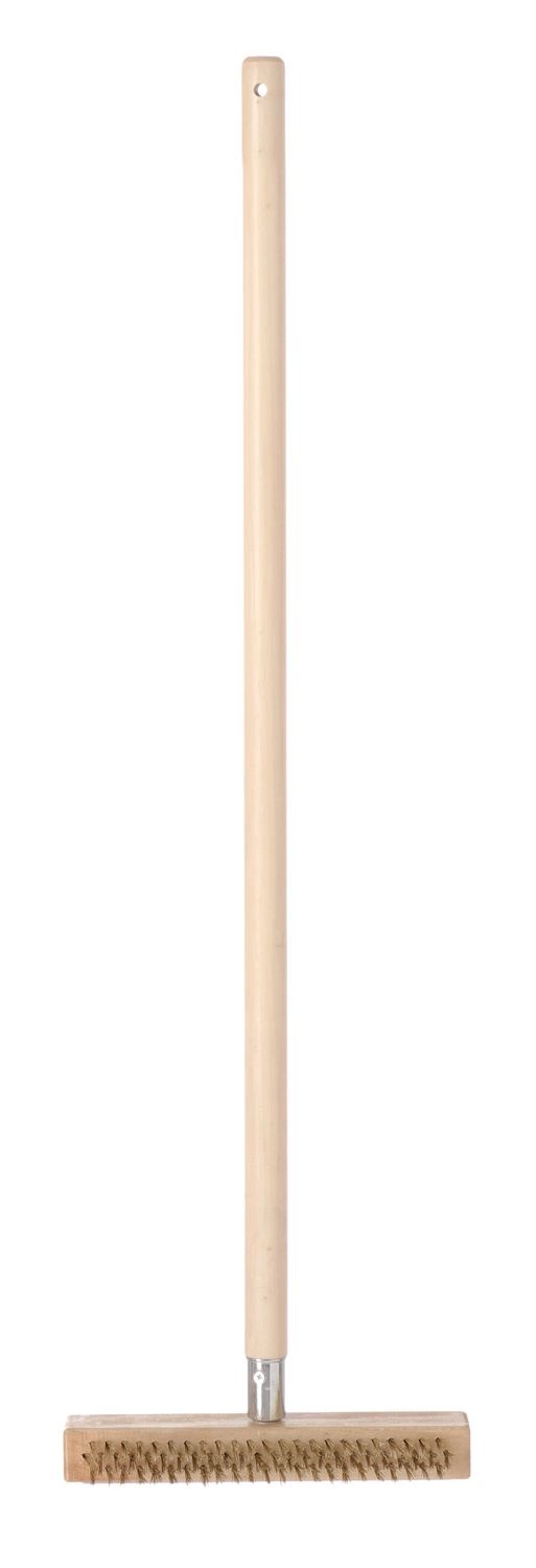 Kefa na čistenie pece na pizzu z mosadzného drôtu. Výrobok má drevenú rukoväť a oceľovú škrabku.