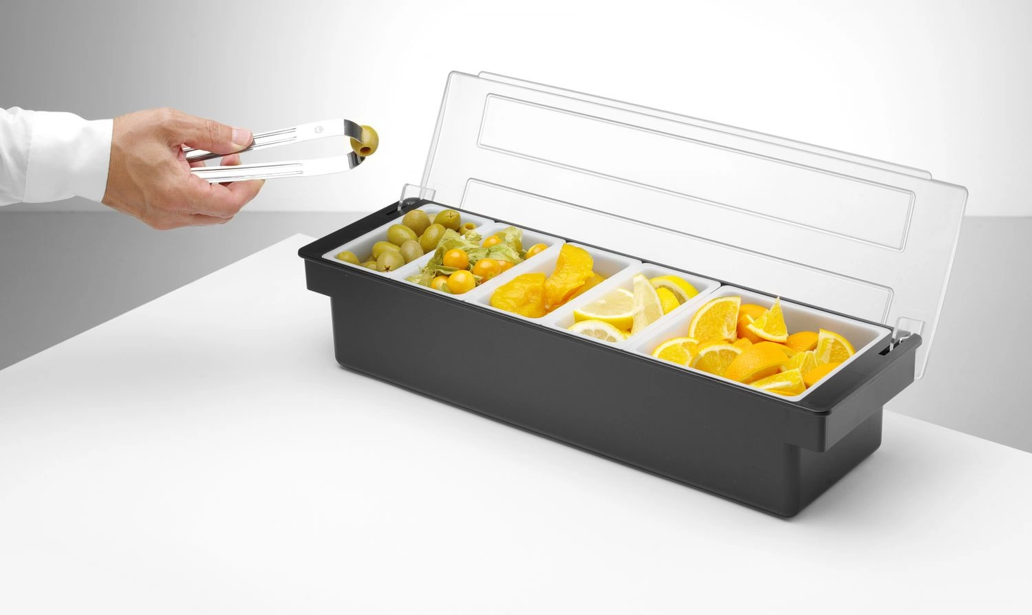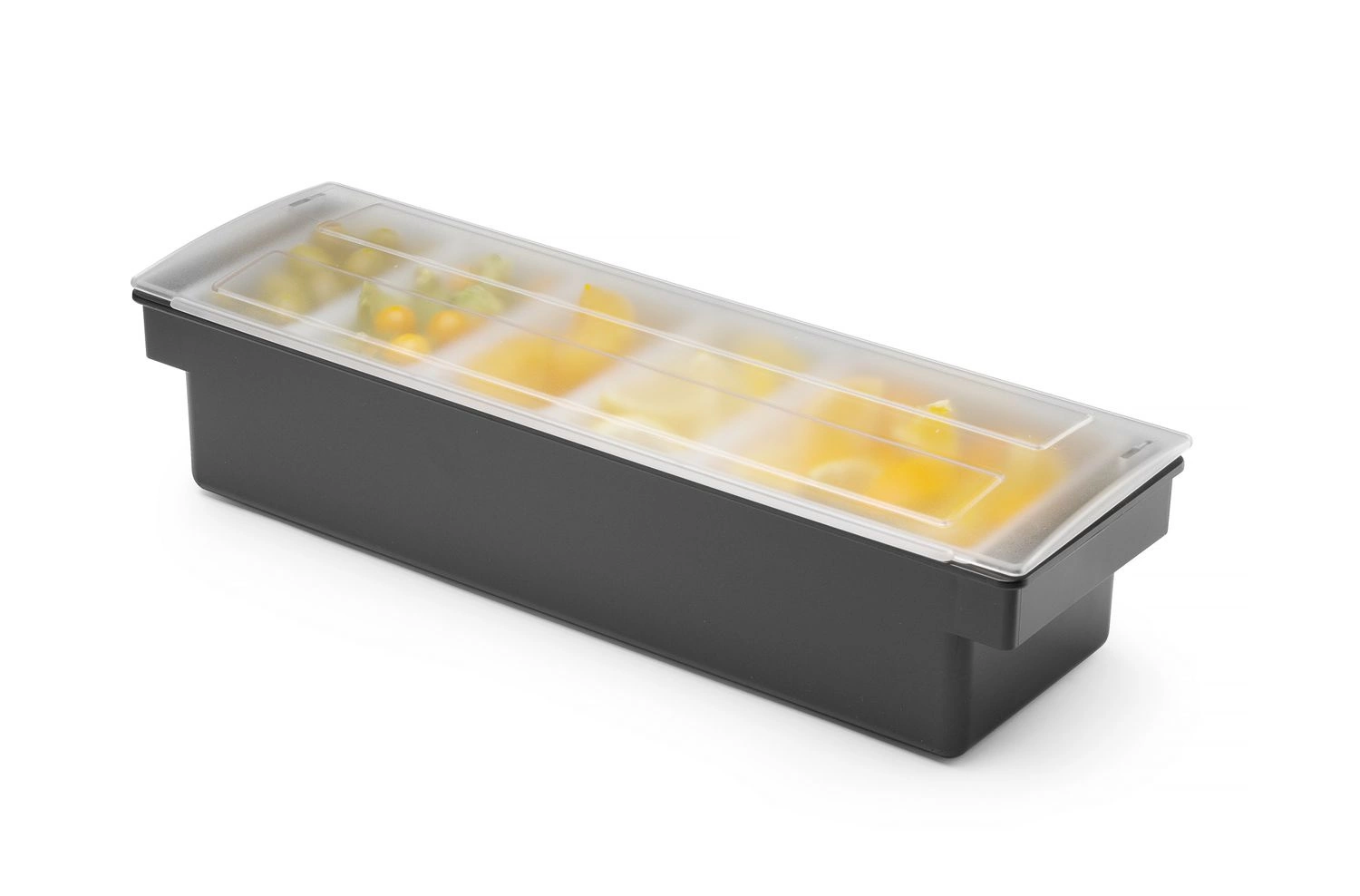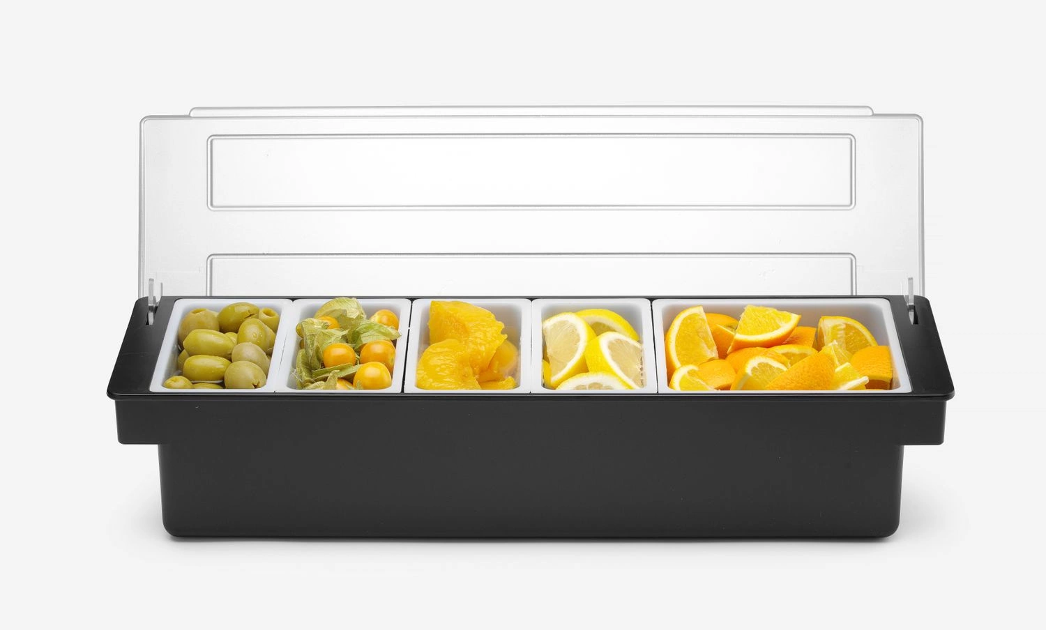 Barmanský kontajner na príslušenstvo k nápojomós. Vyrobené z plastu ABS v čiernej farbe. Priehľadné veko z polykarbonátu. Obsahuje 5 polypropylénových nádobós vložkou.