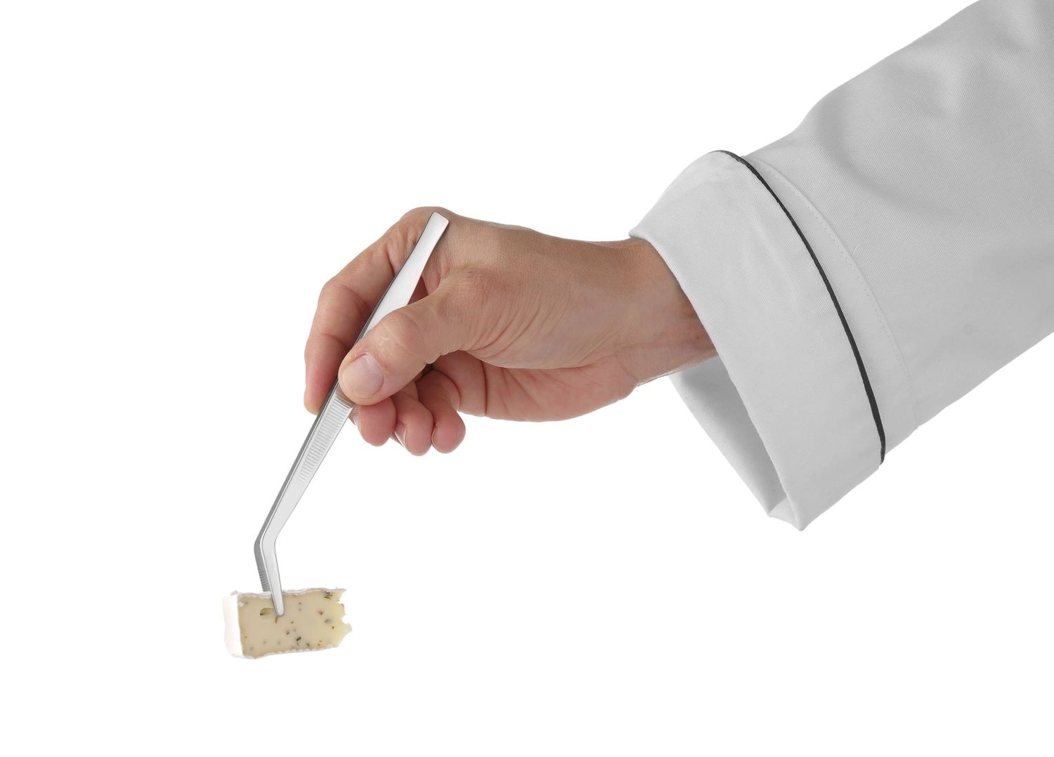 Pinzeta na stravovanie zakrivený s dĺžkou 16 cm. Určená na zdobenie pokrmov a obracanie vyprážaných výrobkov. Možno umývať v umývačke riadu. Čierna farba.