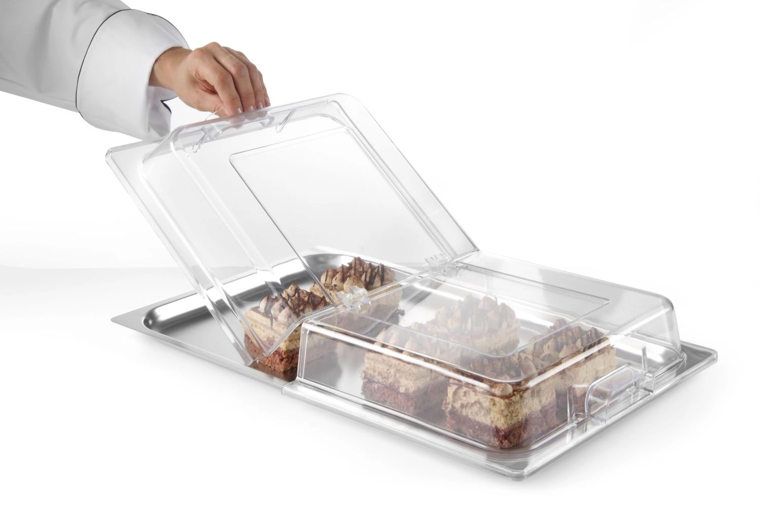 Odklápacie veko Vyrobené z polykarbonátu. Rozmery v norme GN 1/1. Nie je možné umývať v umývačke riadu.