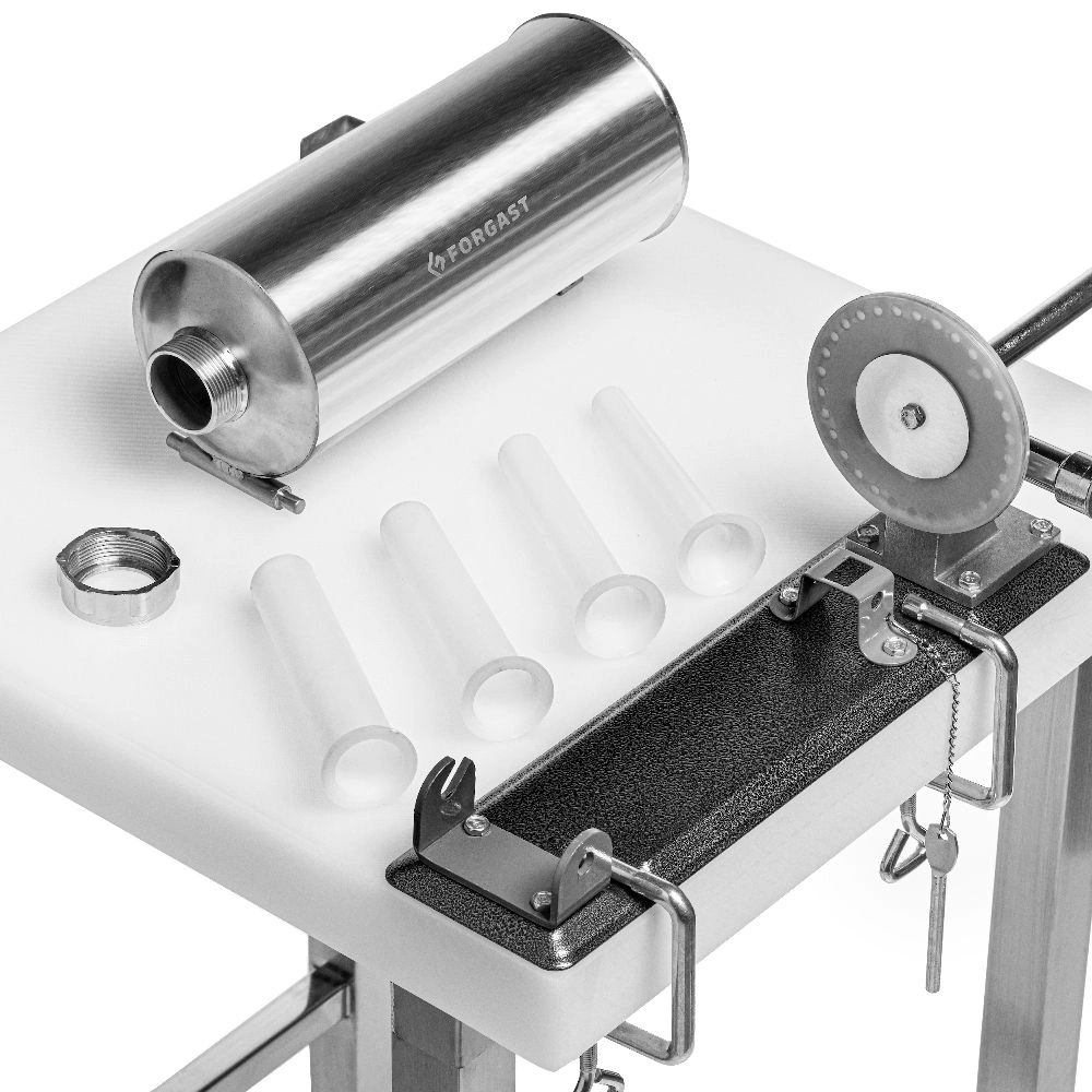 Plnička FORGAST FG10614 má pevnú, horizontálnu konštrukciu, ktorá umožňuje pohodlné umiestnenie valca s plnkou a jednoduché plnenie čriev. Zariadenie je vybavené štyrmi plastovými nástavcami s priemermi 14, 18, 22 a 26 mm. Vďaka tomu môžete pripraviť ako tenké klobásky na gril, tak aj hrubšie domáce výrobky. Použitie nerezovej ocele v plášti a častiach prichádzajúcich do kontaktu s potravinami zaručuje bezpečnosť a jednoduché čistenie po skončení práce.