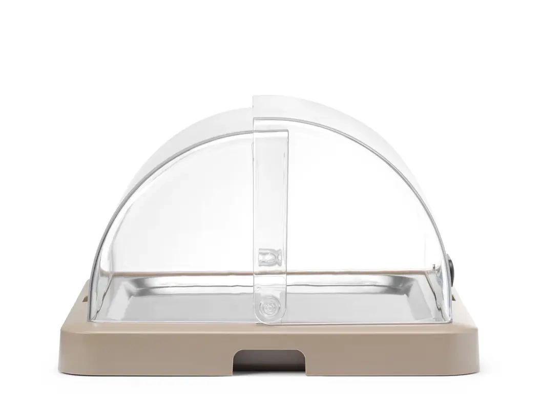 - Roll-top veko z PET – priehľadné veko sa otvára v uhle až 90°, čo umožňuje ľahký prístup k jedlám a zvyšuje komfort obsluhy pri servírovaní na bufete.