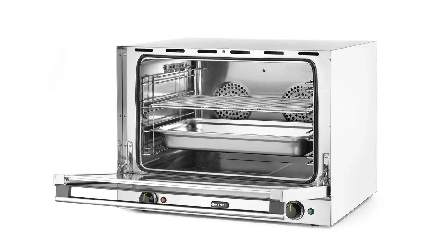 - Dvojité ventilátory a ohrievače – rovnomerné rozloženie tepla v komore pece urýchľuje prípravu jedál a umožňuje dosiahnuť opakovateľné výsledky bez ohľadu na počet dávok.