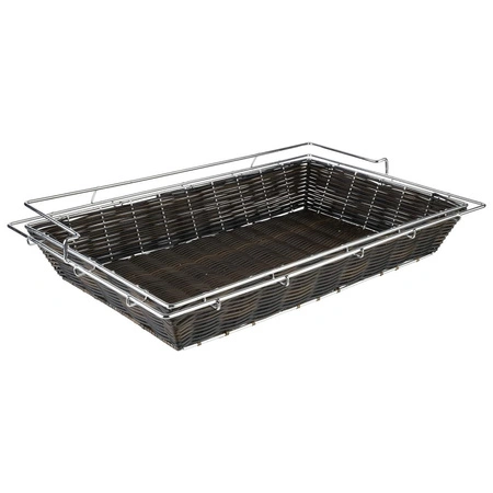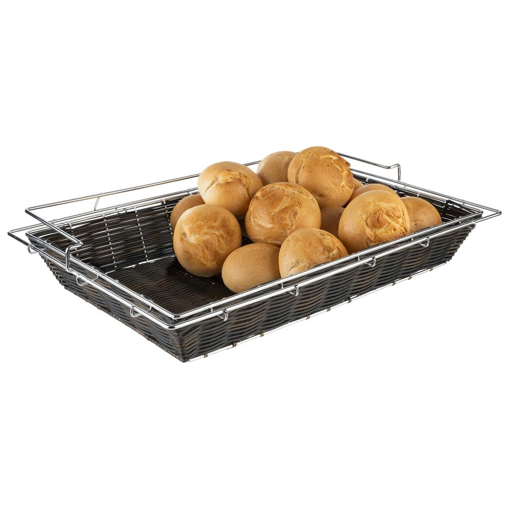 Tento obdĺžnikový košík na pečivo je praktickým a pevným riešením na servírovanie pečiva počas bufetov, hotelových raňajok alebo cateringových akcií. Produkt sa vyznačuje odolnou konštrukciou z polypropylénu a upevňovacím rámom z nehrdzavejúcej ocele, ktorý účinne zabraňuje posúvaniu košíka počas používania. Vďaka univerzálnemu tvaru a estetickému vzhľadu sa skvele hodí ako do profesionálnych gastronomických prevádzok, tak aj do domácej kuchyne.