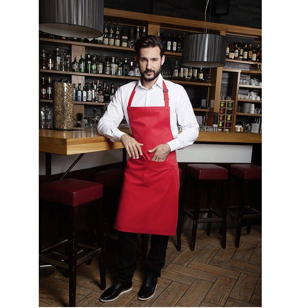 Kuchárska zástera Basic značky Karlowsky. Červená farba. Vyrobené v 65% polyester / 35% bavlna. . Diagonálna väzba. Rozmery 75x90 cm. Zástera s popruhmi zo zásterového materiálu so zosilnenými napínacími bodmi - popruh na krk so sponou na nastavenie dĺžky cca 70 cm - náplasťové vrecko s 2 priehradkami (40 x 20 cm). Možno prať v práčke a čistiť chemicky. Vhodné na žehlenie.