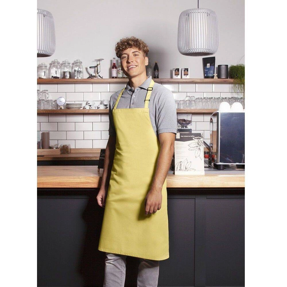 Kuchárska zástera Basic značky Karlowsky. Slnečná žltáófarba. Vyrobené v 65% polyester / 35% bavlna. . Diagonálna väzba. Rozmery 75x90 cm. Zástera s popruhmi zo zásterového materiálu so zosilnenými napínacími bodmi - popruh na krk so sponou na nastavenie dĺžky cca 70 cm. Možno prať v práčke a čistiť chemicky. Vhodné na žehlenie.