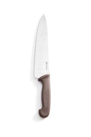 HACCP Hnedé mäso kuchára nón. Vyrobené z nehrdzavejúcej ocele, rukoväť z hnedého polypropylénu. Dĺžka čepele 24 cm, celý nôž 38,5 cm. N Možno umývať v umývačke riadu.